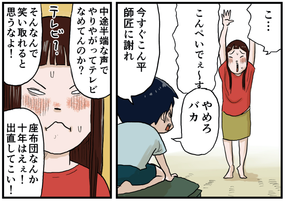 笑いをナメてんのかお前 2021年08月08日 笑いをナメてんのかお前笑点のマネをしていましたね。家中の座布団を集めて座っていました、たくさん積むと以外にバランスを取るのが難しくて、笑点の師匠たちはすごいなあと思いました。しかしいくるの審査は厳しいですね…姉ちゃんの渾身の一発ギャグだったのに… 「いくる(弟)」カテゴリの最新記事 タグ :#漫画#マンガ#懐かしい#あの頃#思い出#絵日記#笑点#姉弟#座布団#姉ちゃん < 前の記事次の記事 > コメント コメント一覧 (13) 1. 名無しさん 2021年08月08日 07:23 しなの「山田くん、いくるの全部持ってきなさい」 0 仲曽良ハミ がしました 5. 仲曽良 2021年08月08日 23:41 >>1 まったくだ…☺️ 0 仲曽良ハミ がしました 2. 昭和55年生まれ 2021年08月08日 10:15 姉ちゃん、もっとしばいたって!! 0 仲曽良ハミ がしました 6. 仲曽良 2021年08月08日 23:44 >>2 まあまあ☺️ 0 仲曽良ハミ がしました 3. 昭和52年生まれ 2021年08月08日 10:25 昭和な、いくるくんの日常、懐かしすぎて好き! 今の子どもの甘っちょろさよ。。。 昔、兄ちゃんは容赦なかった。(私は妹) 0 仲曽良ハミ がしました 7. 仲曽良 2021年08月08日 23:45 >>3 いくるの日常はみんなの思い出なんですよ☺️ 0 仲曽良ハミ がしました 4. むひ 2021年08月08日 10:34 時代的にアンディフグのマネとか武蔵のマネとかそーゆーことかな 0 仲曽良ハミ がしました 8. 仲曽良 2021年08月08日 23:45 >>4 今度かかと落とし描きます! 0 仲曽良ハミ がしました 9. 2021年08月09日 03:36 姉と座布団重ねて座って引っこ抜いて落ちないように遊ぶやつやってましたわ。 0 仲曽良ハミ がしました 10. 仲曽良 2021年08月09日 14:30 >>9 だるま落としみたいなね☺️ 0 仲曽良ハミ がしました 11. クララ 2021年09月21日 04:32 いい姉ちゃんじゃないか(笑) 0 仲曽良ハミ がしました 12. 名無しさん 2022年12月01日 15:47 この漫画無料で読めるとか神じゃん 0 仲曽良ハミ がしました 13. NEM0 2024年11月09日 08:49 しなのちゃんの必殺ダルマ(いくる)落とし! 0 仲曽良ハミ がしました コメントフォーム 名前 コメント 記事の評価 リセット リセット 顔 星 情報を記憶 コメントを投稿する