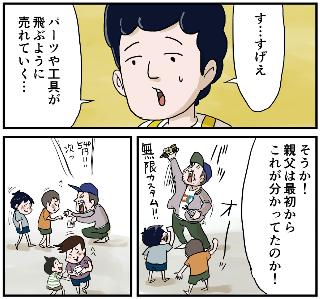 子供達の喜ぶ顔見たいだろ?(後編) 2021年08月19日 前回の話(前編) 子供達の喜ぶ顔見たいだろ?(後編)ミニ四駆はいろんなパーツを組んでオリジナルのカスタムをするのが楽しいんですよね!オヤジはその楽しさを伝えているんです!そのためには多少の投資は覚悟しないとね!最速の男になるんだから!笑 「玩具屋のオヤジ」カテゴリの最新記事 タグ :#漫画#マンガ#懐かしい#あの頃#思い出#絵日記#玩具屋#ミニ四駆 < 前の記事次の記事 > コメント コメント一覧 (9) 1. 昭和55年生まれ 2021年08月19日 16:28 今、気がついた!!!!!! おっちゃん、横浜大洋ホエールズの 帽子、被ってるやん!!! 本編とは関係ないけど・・・・ 0 仲曽良ハミ がしました 6. 仲曽良 2021年08月20日 13:44 >>1 よくぞそこに! 大洋ホエールズです 渋いですね! 0 仲曽良ハミ がしました 2. 2021年08月19日 19:28 商売上手だな。子供にも手は抜かないとこが面白い 0 仲曽良ハミ がしました 5. 仲曽良 2021年08月20日 13:43 >>2 商売人ですねw 0 仲曽良ハミ がしました 3. 名無し 2021年08月19日 21:14 もちろん商売もあるだろうけど、子供を楽しませる為には大人が楽しまなければならない良い見本! 0 仲曽良ハミ がしました 4. 仲曽良 2021年08月20日 13:43 >>3 やったぜオヤジ! 0 仲曽良ハミ がしました 7. 眼鏡まる子 2023年04月28日 20:20 おっちゃんのマミヤTシャツいいな!! 0 仲曽良ハミ がしました 8. F 2023年05月03日 21:27 一瞬漏れた本音がガチの大人の事情やw 0 仲曽良ハミ がしました 9. ひばり 2023年12月12日 00:27 うちの近所にもありました。お小遣いがみるみる吸い取られましたね。 あと、大人になってから「大人だらけのミニ四駆大会」やりました。その昔、腕に覚えのあるいい大人が大人の財力と頭脳を使って…。えげつないマシンだらけでレースしましたよ。すごい楽しかった。 0 仲曽良ハミ がしました コメントフォーム 名前 コメント 記事の評価 リセット リセット 顔 星 情報を記憶 コメントを投稿する