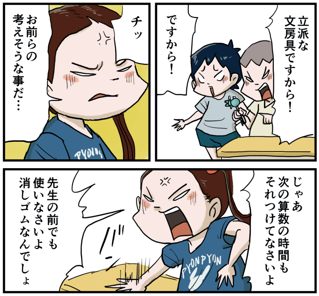コレは消しゴムですから!(前編) 2021年09月13日 コレは消しゴムですから!(前編)噛みつきはあちゃんを知っている人はかなり年齢が限られるかもしれません…笑この手の消しゴムのおもちゃは大好きでしたね。ご親切に鉛筆を指す穴までついてます。メーカーさんの「学校に持っていって広めろ」「流行らせろ」という声が聞こえてきそうな仕様になっておりました。後半シュウの捨て身の様子をお楽しみに! 「マッキー」カテゴリの最新記事 タグ :#漫画#マンガ#懐かしい#あの頃#思い出#絵日記#ガンダム#噛みつきばあちゃん#学校#小学生 < 前の記事次の記事 > コメント コメント一覧 (18) 1. ぼぼ 2021年09月13日 07:06 かみつきばあちゃん知らないなぁ! 49歳です! 0 仲曽良ハミ がしました 2. トラ 2021年09月13日 07:28 >>1 私は知ってる49歳です!笑笑 入れ歯が取れるんですよ。 0 仲曽良ハミ がしました 10. 仲曽良 2021年09月13日 15:35 >>2 脱着可能でした 0 仲曽良ハミ がしました 9. 仲曽良 2021年09月13日 15:35 >>1 よくある消しゴムのおもちゃです ただばあちゃんの形してます 笑 0 仲曽良ハミ がしました 3. 昭和の名無し 2021年09月13日 08:11 噛みつきばあちゃん懐かしー! 文房具屋に「○○を買うとプレゼント」ってポスターがあった気がします。 まずその○○(シャー芯だったかな?)を買う機会がなかったので、手に入れることもありませんでしたが…😅 0 仲曽良ハミ がしました 11. 仲曽良 2021年09月13日 15:36 >>3 たしかその後ガチャガチャであったかもしれません。 0 仲曽良ハミ がしました 4. はる 2021年09月13日 09:08 かみつきばぁちゃん懐かしー! 何個も揃えてましたw 34歳です。 この漫画を読むまで存在を忘れてました! 0 仲曽良ハミ がしました 5. 名無しの権兵衛 2021年09月13日 11:08 全然、消せない消しゴム…っていうか消そうとすると汚くなる😆 0 仲曽良ハミ がしました 12. 仲曽良 2021年09月13日 15:37 >>5 そうなんです! 0 仲曽良ハミ がしました 6. 2021年09月13日 12:05 ガンダムと噛みつきとキンケシは小学校だと放課に滅茶苦茶男子遊んでましたね 後ドラクエのバトえんは盗難騒ぎになったりで持ち込み禁止になりました 0 仲曽良ハミ がしました 13. 仲曽良 2021年09月13日 15:37 >>6 男子は持ってきますよね 0 仲曽良ハミ がしました 7. ゆゆ 2021年09月13日 13:27 かみつきばぁちゃん、懐かしい! 結構重くて字が描きにく買った気がする。 43歳です。 0 仲曽良ハミ がしました 14. 仲曽良 2021年09月13日 15:38 >>7 あんなのつけてかけませんよね 笑 0 仲曽良ハミ がしました 8. Yussa♪ 2021年09月13日 13:44 かみつきばあさん!知ってますー🤣 なぜか我が家にありましたw 27歳です! 0 仲曽良ハミ がしました 15. 仲曽良 2021年09月13日 15:40 >>8 おお!世代を超えてますね 0 仲曽良ハミ がしました 16. そうた 2021年09月13日 15:46 でたー!男子と女子の足の引っ張り合い かつ 不毛な争い。女子は男子がキライなのかそれもと先生褒められたいのか。そんな事気にするなよって事を告げ口しますよねw あと、キャラ消しは名前こそ 消しゴム ではありますが、一回もきれいに消せた事がありません。これで消すと鉛筆やシャーペンの黒とキャラ消しの色が混ざって酷く汚れましたね。今は進化したのかなー。 0 仲曽良ハミ がしました 17. 仲曽良 2021年09月13日 20:54 >>16 消せれば消しゴムとして持っていけるかも☺️ 0 仲曽良ハミ がしました 18. ヘッドロココ 2024年05月06日 21:22 同じこと先生に言ったけど普通に没収されたな 0 仲曽良ハミ がしました コメントフォーム 名前 コメント 記事の評価 リセット リセット 顔 星 情報を記憶 コメントを投稿する