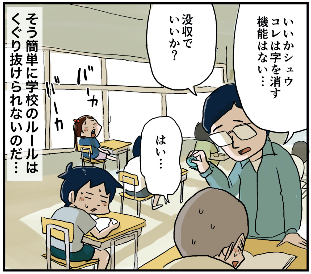 コレは消しゴムですから!(後編) 2021年09月14日 前回のお話 コレは消しゴムですから!(後編)先生にこの屁理屈は通用しませんでしたね…こんなもん許してたら他の生徒に示しがつきませんもんね。しかし先生…冷静に納得させてからの没収が何とも… 笑 昭和のいい先生です。 「マッキー」カテゴリの最新記事 タグ :#漫画#マンガ#懐かしい#あの頃#思い出#絵日記#ガンダム#噛みつきばあちゃん#学校#小学生 < 前の記事次の記事 > コメント コメント一覧 (28) 1. 昭和時代の小学生 2021年09月14日 07:22 先生、NICE! 仮に消せたとしても、消しゴムの形が変わってしまうのが勿体なくて、消せない(使えない)のでは? 0 仲曽良ハミ がしました 15. 仲曽良 2021年09月15日 06:14 >>1 絶対使わないですよね☺️ 0 仲曽良ハミ がしました 2. そうた 2021年09月14日 07:24 シュウゥゥゥゥー(涙) 0 仲曽良ハミ がしました 16. 仲曽良 2021年09月15日 06:15 >>2 エイドリアァァン!(涙) 0 仲曽良ハミ がしました 3. フユナ 2021年09月14日 07:51 アララララ(笑)その消しゴム家にもあったなぁ(•‿•) 0 仲曽良ハミ がしました 17. 仲曽良 2021年09月15日 06:16 >>3 流行りましたよね☺️ 0 仲曽良ハミ がしました 4. 名無しの権兵衛 2021年09月14日 07:53 やっぱ、そうなるのね〜😆 0 仲曽良ハミ がしました 18. 仲曽良 2021年09月15日 06:16 >>4 ほらみろってね☺️ 0 仲曽良ハミ がしました 5. おーちゃん 2021年09月14日 08:01 そう、消せないんですよね〜 僕はいざという時の消しゴム代わりにと持っていって、いざ使う時が来た!という時には、紙が『ビリッ』と破けましたね〜 懐かしい 0 仲曽良ハミ がしました 19. 仲曽良 2021年09月15日 06:17 >>5 分かります硬いから紙破けますよね☺️ 0 仲曽良ハミ がしました 6. 球猫 2021年09月14日 08:02 かみつきばあちゃんの消し後が、 経験者でないと表現できないリアルさ..w 0 仲曽良ハミ がしました 20. 仲曽良 2021年09月15日 06:18 >>6 そこ気付いてくれて嬉しいです☺️ 0 仲曽良ハミ がしました 7. タキオ 2021年09月14日 08:14 ウォーズマンのコーホーwww 0 仲曽良ハミ がしました 21. 仲曽良 2021年09月15日 06:18 >>7 お決まりですね☺️ 0 仲曽良ハミ がしました 8. 昭和な女 2021年09月14日 08:18 シュウの執念、及ばず。 先生に冷静に怒られるのって、ドギマギしましたよね💧 あれは消しゴムという名の、ゴムの塊ですな。 0 仲曽良ハミ がしました 22. 仲曽良 2021年09月15日 06:19 >>8 はいただの塊です☺️ 0 仲曽良ハミ がしました 9. しゃけ 2021年09月14日 08:45 いちご 一人24個は 結構キツイ w 0 仲曽良ハミ がしました 14. きょうすけ 2021年09月14日 22:00 >>9 約1パックです。大粒のあまおうは8粒くらいしか入ってないし。贅沢🍓 0 仲曽良ハミ がしました 28. 仲曽良 2021年09月15日 06:22 >>14 一人じゃ食い切れませんねw 0 仲曽良ハミ がしました 23. 仲曽良 2021年09月15日 06:19 >>9 食い切れませんw 0 仲曽良ハミ がしました 10. あきち 2021年09月14日 17:21 正に「教え諭す」先生ですね(^^) 指導に優しさがあるなぁ〜♪ 0 仲曽良ハミ がしました 24. 仲曽良 2021年09月15日 06:19 >>10 優しいですよね先生☺️ 0 仲曽良ハミ がしました 11. 2021年09月14日 18:29 ゴムで作られてるけど、消しゴムの機能全く無いんですよね 女の子だとお弁当やら果物やらアイスやらの分解出来る消しゴム使わないで筆箱入れてた子多かったなぁ 0 仲曽良ハミ がしました 25. 仲曽良 2021年09月15日 06:20 >>11 香りを楽しむやつですね☺️ 0 仲曽良ハミ がしました 12. シロノ輪 2021年09月14日 20:14 わかるwww ウォーズマン描いたら絶対コーホーって描くwww 0 仲曽良ハミ がしました 26. 仲曽良 2021年09月15日 06:21 >>12 命を吹き込む作業ですね☺️ 0 仲曽良ハミ がしました 13. 昼寝部 2021年09月14日 21:05 ノック式ボールペンで遊ぶ、"スーパーカー消しゴム"と同じですな。 私らの頃は、ミニ四駆消しゴム(レッツ&ゴー世代)でした。 0 仲曽良ハミ がしました 27. 仲曽良 2021年09月15日 06:21 >>13 そんな感じですねw 0 仲曽良ハミ がしました コメントフォーム 名前 コメント 記事の評価 リセット リセット 顔 星 情報を記憶 コメントを投稿する