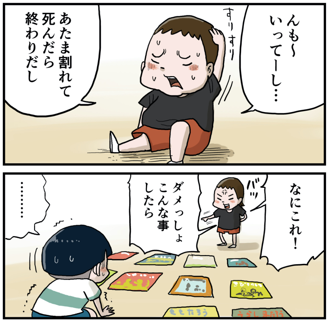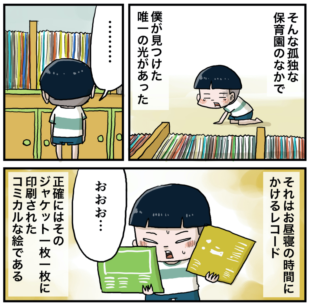 母さんの背中(その2) 2021年10月19日 前回の話(その1) 母さんの背中(その2)お昼寝の時間に童話的なレコードがかかるんですよ。いつもそれを楽しみにしてたんですけど、ある日そのレコードをみてみたらジャケットの絵が面白くてハマったんです。好きなやつを数枚選別して床に並べるんですよ、そしたらお店みたいで楽しかったのを覚えています。次回のいくるはさらなるパニックに落ち入ります。お楽しみに! 「いくる(弟)」カテゴリの最新記事 タグ :#思い出#懐かしい#お母さん#保育園 < 前の記事次の記事 > コメント コメント一覧 (7) 1. 昭和55年生まれ 2021年10月19日 12:39 いくるは繊細な子なのね 0 仲曽良ハミ がしました 2. 仲曽良 2021年10月19日 15:11 >>1 はい、実は繊細ですw 0 仲曽良ハミ がしました 3. 2021年10月19日 16:00 これはいい、豚が緑だ…笑笑 かわいい! 0 仲曽良ハミ がしました 5. 仲曽良 2021年10月20日 16:41 >>3 彼にとってはいいんでしょうね 笑 0 仲曽良ハミ がしました 4. そうた 2021年10月19日 19:45 レコードジャケットを広げてるのもいけないが、保育園の建物内を周りも見えないほどの勢いで走るのもダメなのでは? 0 仲曽良ハミ がしました 6. 仲曽良 2021年10月20日 16:44 >>4 どっちもどっちですねw 0 仲曽良ハミ がしました 7. マッキーマニア 2021年11月06日 19:48 このページだけマッキー(次の話リンク)がいないじゃん!リンク貼ってくださいなっ 0 仲曽良ハミ がしました コメントフォーム 名前 コメント 記事の評価 リセット リセット 顔 星 情報を記憶 コメントを投稿する