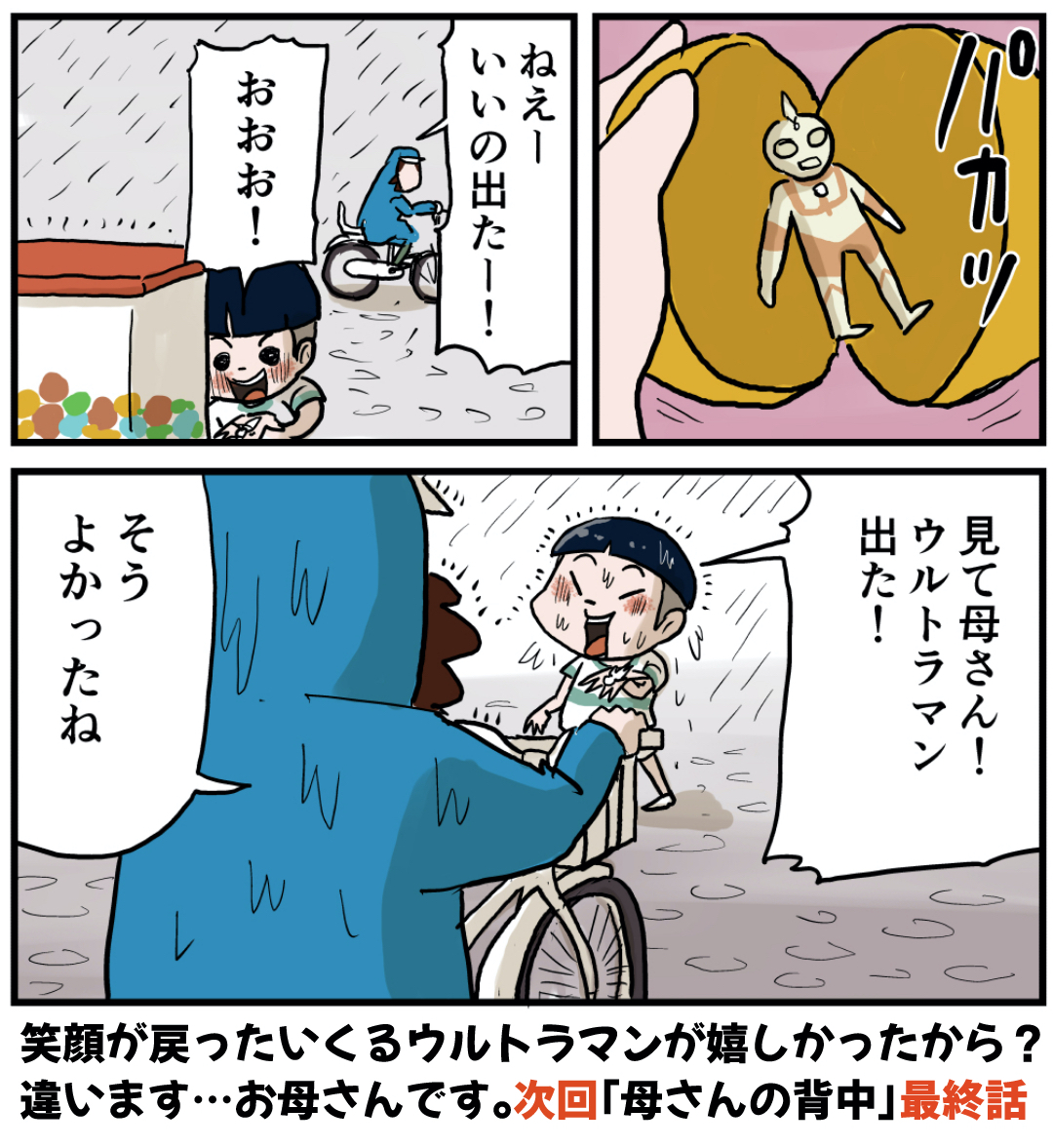 母さんの背中(その5) 2021年10月22日 母さんの背中編を最初から読む 母さんの背中(その5)いくるの笑顔が戻る…つまりはお母さんとのコミュニケーションはとても安心なのですね。お母さんの言っている意味が分かっているかは微妙ですが、やりたい様にしなさいと背中を押してくれたのはいつもお母さんの様に思いました。 「いくる(弟)」カテゴリの最新記事 タグ :#思い出#懐かしい#お母さん#保育園#雨#ガチャガチャ < 前の記事次の記事 > コメント コメント一覧 (12) 1. 昭和55年生まれ 2021年10月22日 13:22 親は子供の喜ぶ顔が 見たいだけやねんな〜 0 仲曽良ハミ がしました 7. 仲曽良 2021年10月27日 00:23 >>1 そうですよねw 0 仲曽良ハミ がしました 2. いっさん 2021年10月22日 13:49 いつも読んでて心が温かくなります。 0 仲曽良ハミ がしました 8. 仲曽良 2021年10月27日 00:24 >>2 ありがとうございます! 0 仲曽良ハミ がしました 3. よこ 2021年10月22日 15:09 子どもが悲しんでたら自分も悲しくて、嬉しそうなら自分も嬉しい。親っていくつになってもそうですよね。 いくるくん家は母さんも父さんもほんとにカッコいい! 0 仲曽良ハミ がしました 10. 仲曽良 2021年10月27日 00:25 >>3 いくるは幸せものです! 0 仲曽良ハミ がしました 4. 母は太陽 2021年10月22日 16:44 お母さん最高すぎて泣きそう 0 仲曽良ハミ がしました 9. 仲曽良 2021年10月27日 00:24 >>4 お母さん最高ですね! 0 仲曽良ハミ がしました 5. そうた 2021年10月23日 09:22 母ちゃんすげぇ 0 仲曽良ハミ がしました 11. 仲曽良 2021年10月27日 00:25 >>5 母ちゃん最強ですね 0 仲曽良ハミ がしました 6. アユマジロ 2021年10月23日 16:29 お母さん最高〜😆👍✨ 無理やり聞き出したりしないで、楽しいことを一緒にしてくれるなんて!理想のお母さん😊 0 仲曽良ハミ がしました 12. 仲曽良 2021年10月27日 00:38 >>6 お母さんは好きなものも知ってますからね☺️ 0 仲曽良ハミ がしました コメントフォーム 名前 コメント 記事の評価 リセット リセット 顔 星 情報を記憶 コメントを投稿する