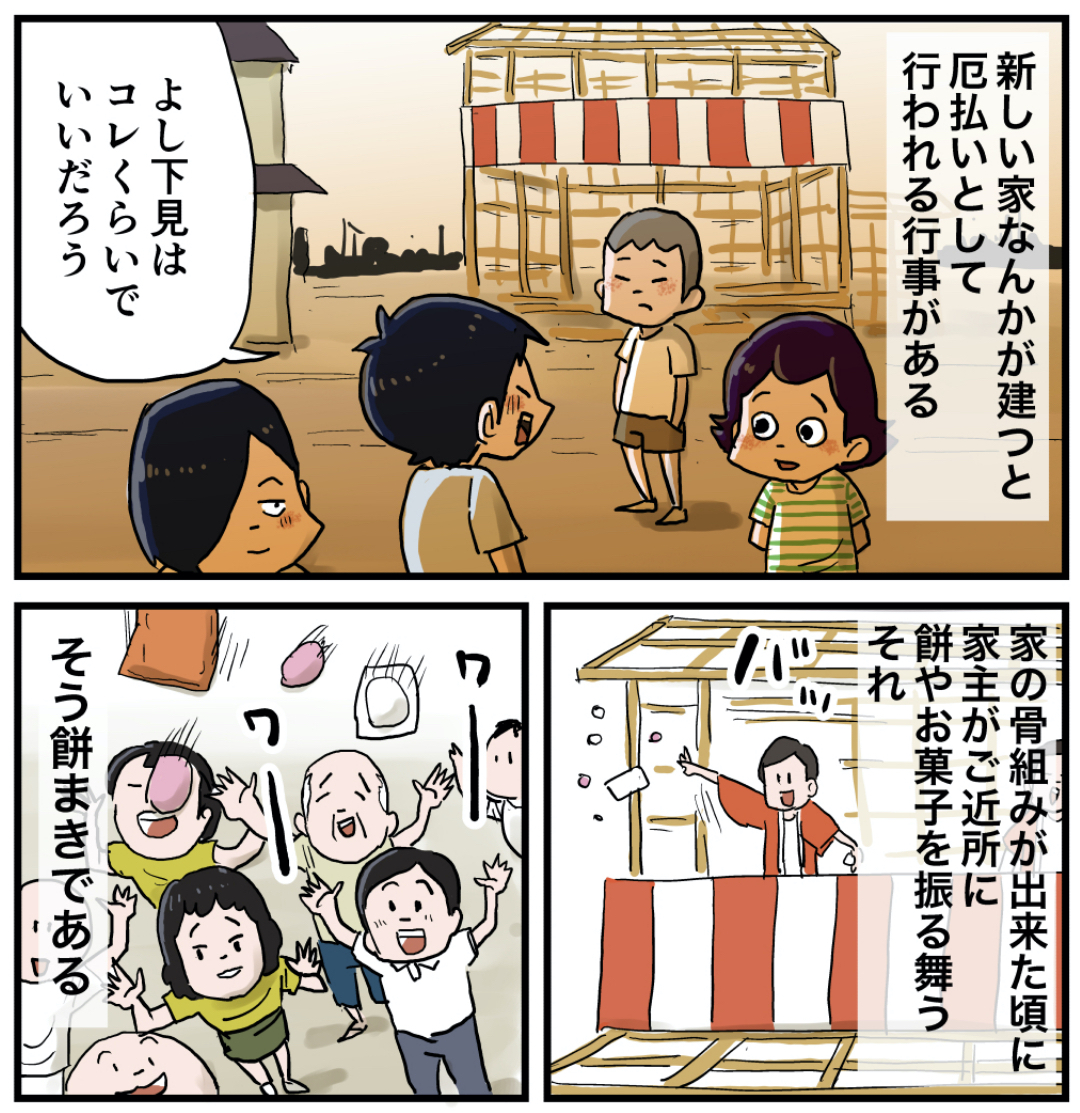 近所にこんなに子どもいたか?って言うくらい集まったの覚えてます。このあと骨組みだけのマイホームで大工さんとか親戚とか親しいご近所さんと宴会をするのです。いい時代。