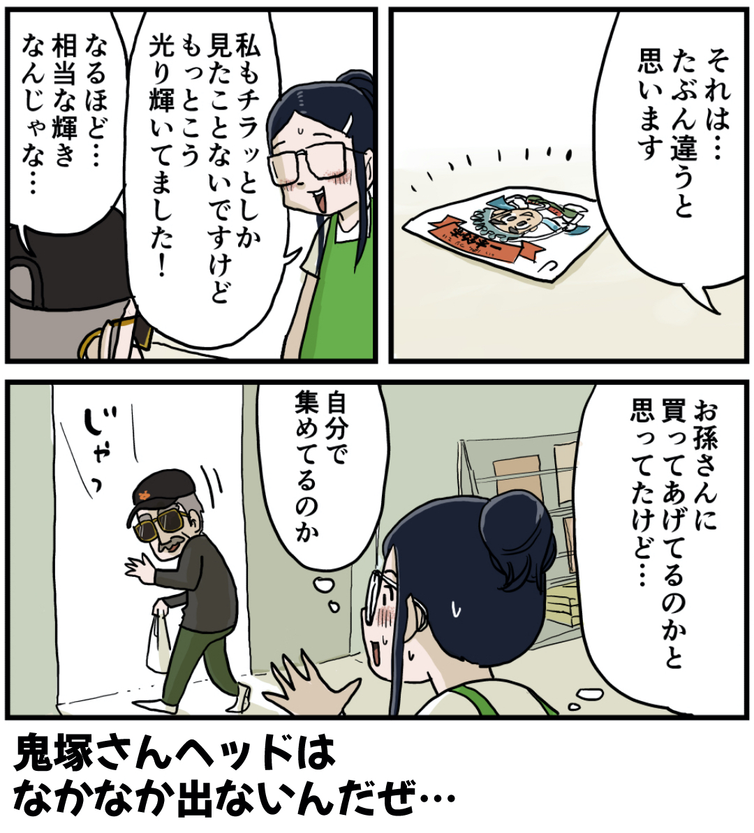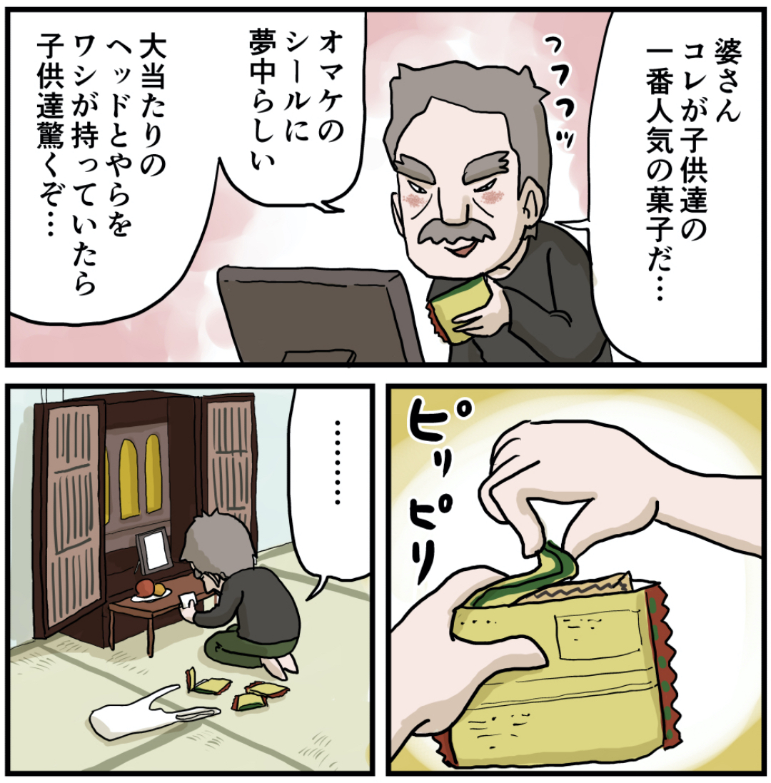 オニの鬼塚さん(その6 後) 2022年05月12日 鬼塚さん編を最初から読む 前の話 次回に続く!ラインで更新をお知らせできます!登録をしてね! 【お知らせ!】『しなのんちのいくる』書籍化決定!!!ご予約はこちらから↓しなのんちのいくる仲曽良ハミKADOKAWA2022-06-23 読みやすくまとめました是非他の作品も読んでみてください まだまだ続くよ!フォロワーさんがガチで選んでくれた好きな話おすすめの長編もあります是非読んでみてください! 「鬼塚さん」カテゴリの最新記事 < 前の記事次の記事 > コメント コメント一覧 (17) 1. フィガロ 2022年05月12日 12:21 シール集めとゆー新しい趣味が出来た👍 0 仲曽良ハミ がしました 2. ちむちむ 2022年05月12日 12:22 ほしくなったね、これは。おじいさんもかつては男子だからな。 0 仲曽良ハミ がしました 3. そうた 2022年05月12日 12:28 オニさん、やはり開けてしまわれたか😄 0 仲曽良ハミ がしました 4. ヒイロ 2022年05月12日 12:32 学校から帰ってきてすぐに、近所で唯一のコンビニにダッシュしてビックリマンを買いにいくのが楽しみで。そこに友人もきてて、残り2つのビックリマンを1つずつ買い、開けてみると…。 自分は悪魔で、友人はピンクヘッドの愛染かぐや!! もうショックありすぎて、いまだに覚えてますね…羨ましかったです!w✨ 0 仲曽良ハミ がしました 5. らくだまる 2022年05月12日 12:56 涙ぐましい努力が胸にしみます。おじいさん 0 仲曽良ハミ がしました 6. 本気と書いてマジ 2022年05月12日 13:17 たっぷり買い占めて探したら出る可能性があるけどね ところで自分が開封しているという事は、当たり🎯をあげたいのかな? 子供らは開封の義も楽しみにしてると思うけど 0 仲曽良ハミ がしました 7. ビックリマン? 2022年05月12日 13:39 ヘッドロココ? スーパーゼウスとか神様が出て来るアニメキャラ! 0 仲曽良ハミ がしました 8. おりば 2022年05月12日 13:54 ボクが小1の時に通ってた駄菓子屋は100円分ビックリマン以外の駄菓子を買わないとビックリマンが買えないシステムでした😫 当時を思い返すエピソードが多くて凄く好きな作品です。書籍版も予約させていただきました! 0 仲曽良ハミ がしました 9. 名無しのなっちゃん 2022年05月12日 14:02 鬼塚さん新しい生き甲斐が見つかったみたいで嬉しい! 0 仲曽良ハミ がしました 10. kyakya 2022年05月12日 15:19 あー、先に開けちゃったかー… 子どもたちは 開ける楽しみもあったけど… 0 仲曽良ハミ がしました 11. 寿司🍣 2022年05月12日 15:52 お菓子で仲良くからビックリマンでヘッド出して尊敬されようにシフトしてきたのかな? ヘラクライスト辺りだと前の弾がブラックゼウスのホログラム位かな? 0 仲曽良ハミ がしました 12. だいこんさん 2022年05月12日 19:22 もし出たシールをあげるために集めているのなら人数分揃えないとケンカが起きちゃう(笑) 自分の時も3個ルールあったけど、過保護な友達が親に頼んでケースで大人買いしてて、遊びに行くといつもオヤツで封が切られたビックリマンを出してくれてた。 もちろん自分はチョコも美味しく食べる派なので嬉しかったが、なんとなく嫉妬心から悔しさトッピングの味がした思い出があります。 0 仲曽良ハミ がしました 13. シャーマンカーン 2022年05月12日 21:56 鬼爺!右の奥から3番目だ! 0 仲曽良ハミ がしました 14. あつし 2022年05月12日 23:03 なぜ仏壇の前で開封する?バアさんのご利益を頂く為か? 0 仲曽良ハミ がしました 16. 2022年05月13日 05:36 >>14 茶の間で会話するのと同じ 婆さんと話しながら開けただけだよ 0 仲曽良ハミ がしました 15. QB 2022年05月13日 04:08 一本釣帝・・・ 前にシュウがヘラクライスト出してたから丁度同じ時期ってのがわかるねぇ (*´∀`) 0 仲曽良ハミ がしました 17. しらす 2022年05月13日 08:11 いくつかコメントにあるように、子供たちにあげたいなら開ける楽しみもあるから開封せずにあげた方がいいだろうけど、鬼塚さんはただ単に子供たちが好きなお菓子をあげて喜ばせたいというより、「ワシ、ヘッド持ってるぞ」って自分も子供たちの仲間のように接したいんじゃないですかね。 お菓子あげて「ありがとう鬼塚さん」より、シール見せて「スゲー!!」って友達みたいに打ち解けたいみたいな。 まあ、最終的にはシールはあげようと思ってるのかもしれないけどね。 なにはともあれ、鬼塚さんがんばって〜。 0 仲曽良ハミ がしました コメントフォーム 名前 コメント 記事の評価 リセット リセット 顔 星 情報を記憶 コメントを投稿する