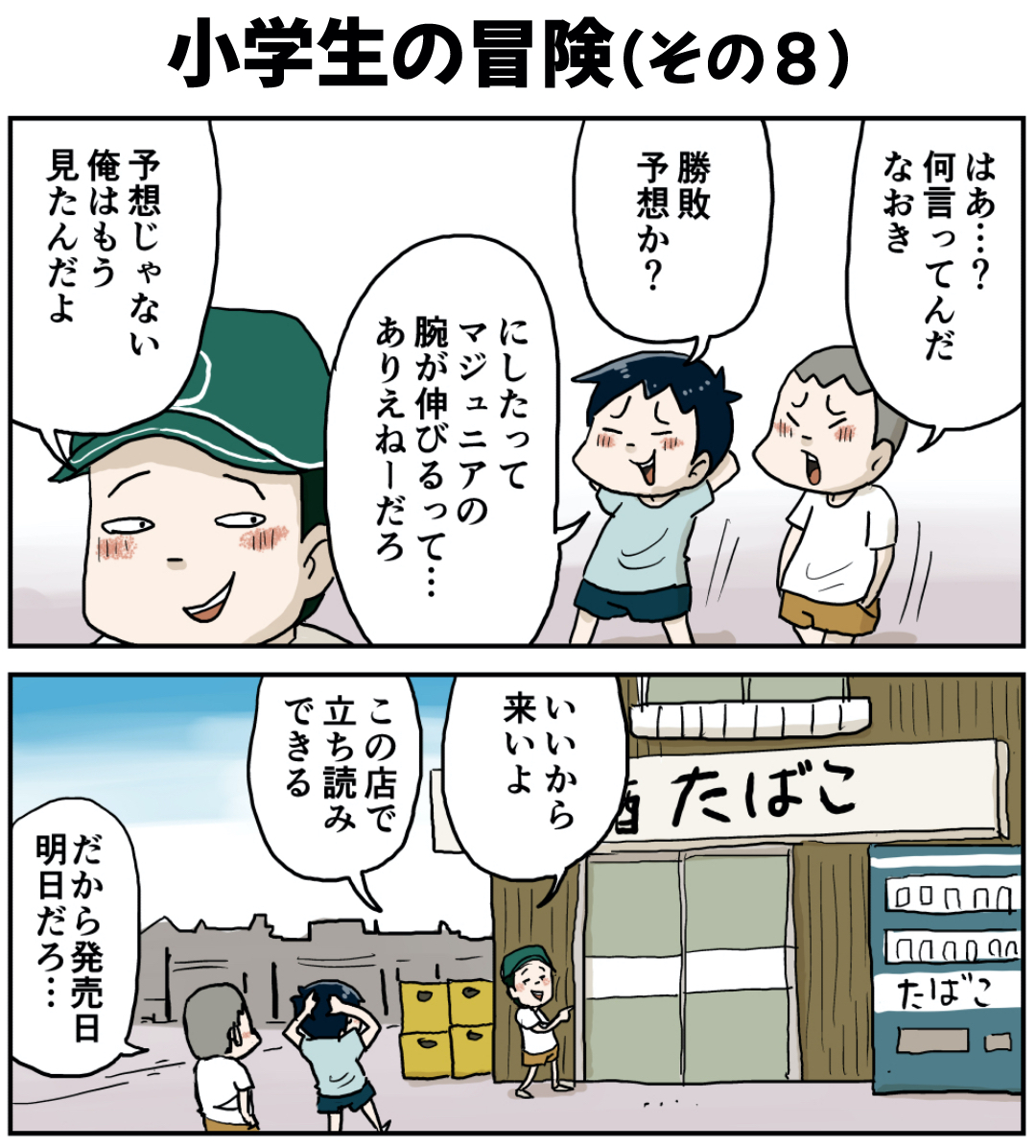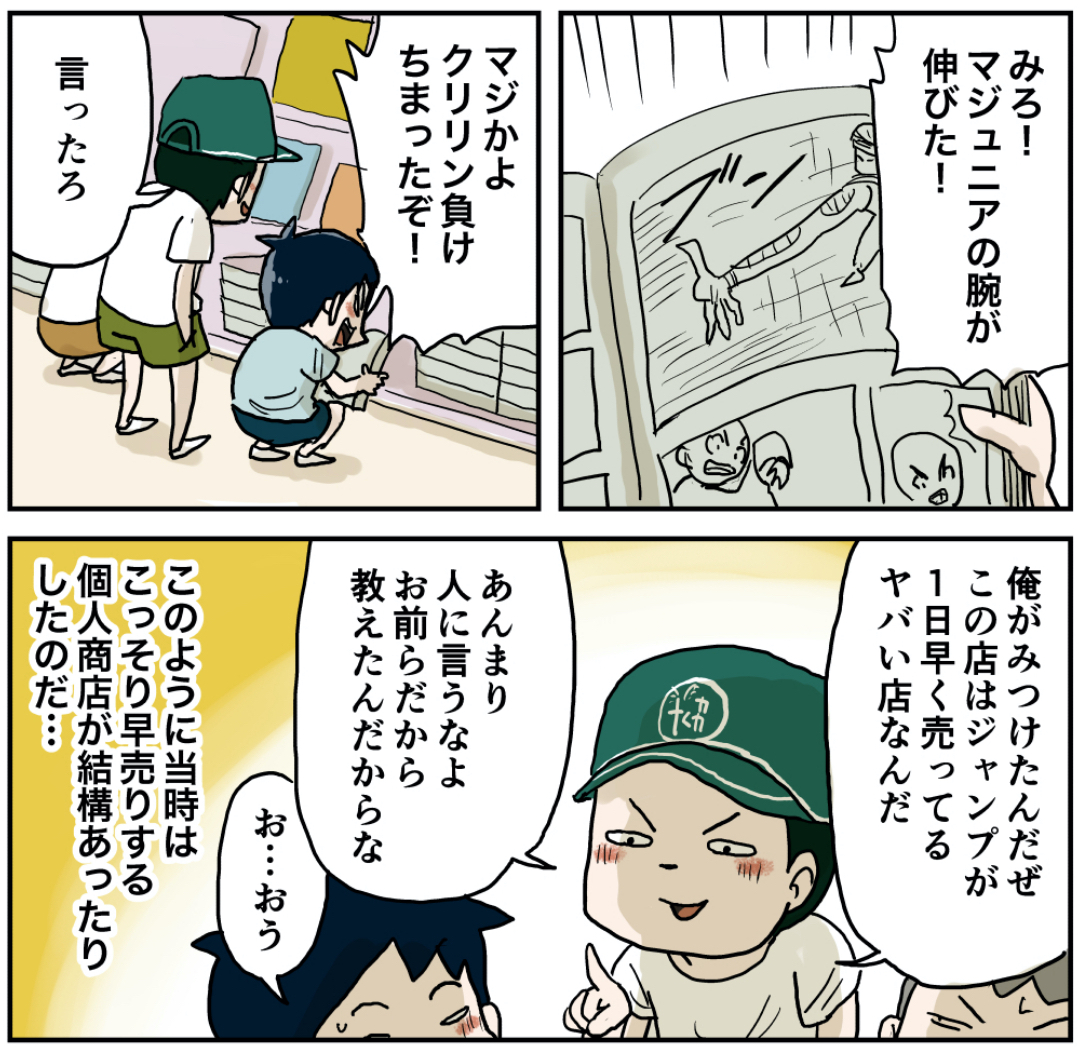小学生の冒険(その8 前)明日発売のはずなのに!なぜ! 2022年06月29日 「小学生の冒険」編を最初から読む 前の話 闇ルートを共有する小学生たち…次回に続く! 次の話 ラインで更新をお知らせできます!登録してね!【お知らせ!】『しなのんちのいくる』書籍化決定!!!ご予約はこちらから↓しなのんちのいくる仲曽良ハミKADOKAWA2022-06-23 読みやすくまとめました是非他の作品も読んでみてください まだまだ続くよ!フォロワーさんがガチで選んでくれた好きな話おすすめの長編もあります是非読んでみてください! 「いくる(弟)」カテゴリの最新記事 < 前の記事次の記事 > コメント コメント一覧 (17) 1. アサイ 2022年06月29日 14:07 いつも楽しく読ませてもらってます。 90年生まれですが、なんとなく名残があった田舎住みです笑 ジャンプいいですねぇ。 早売り、自分の地元(県全体)はなぜか日曜発売でした。 0 仲曽良ハミ がしました 2. ゆうすけ 2022年06月29日 14:14 確かに売っていたなぁ。 今なら完全にアウトだ。 0 仲曽良ハミ がしました 3. 石突 2022年06月29日 14:35 そんなお店に配達してました。 今も売ってるお店はあるみたいだよ 0 仲曽良ハミ がしました 4. カケル 2022年06月29日 14:36 自分の地元は木曜日に売ってましたね すぐに読みたいから買って、店の前で読んでたら、「バレたら売れなくなるから、家で読め!!」って怒られました笑 0 仲曽良ハミ がしました 5. 昭和55年生まれ 2022年06月29日 14:56 こういう情報を持ってるヤツは 人気者でしたね。 その友達は、口が固かったので 私には教えてくれませんでした(笑) 0 仲曽良ハミ がしました 6. そらすけ 2022年06月29日 14:58 ありましたねー 僕は土曜日に買っていました。 0 仲曽良ハミ がしました 7. junkrocky 2022年06月29日 15:36 私も毎週早出しの店で買って(ここ大事)、皆で回し読みしてましたー👍 0 仲曽良ハミ がしました 8. きゃぽ 2022年06月29日 15:47 今も土曜日に売ってる店ありますね…。 0 仲曽良ハミ がしました 9. 昭和生まれ 2022年06月29日 15:47 土曜に売ってるのがデフォで、金曜が早売りみたいな感じだったなぁ。。 0 仲曽良ハミ がしました 10. ななし 2022年06月29日 19:11 懐かしいですねw 友人の家が個人商店で、ジャンプも仕入れていたので 真っ先に読ませてもらってました☺️ 0 仲曽良ハミ がしました 11. なまえがなしお 2022年06月29日 21:49 病院の売店でめっちゃ早く売ってた 月曜前に購入する人は名前書くという謎システムがあって恐かった あと店員さんに「ここの入院患者さんですよね」と聞かれるけど、同級生みんな平気で「ハイ!」と元気に返事してゲットしてました ごめんなさいm(_ _)m 0 仲曽良ハミ がしました 15. だいこんさん 2022年06月30日 07:49 >>11 自分の地域も病院内の売店だけ早売りしてました。確かめてないのでうろ覚えですが、金曜日に発売なんて噂もありました。ただやっぱり入院患者にしか売れないらしく、友達は買いに言ったけど断られたと言っておりました。その結果病院売店早売りの噂もなくなりました。 余談ですがアニメのドラゴンボールZ。関東だとよる7時でしたが夏休みに四国に里帰りした際、夕方4時からの放送でした。しかも関東より内容が1週間以上遅れており、同じものみるはめになったし、帰ったら一話以上みてない状態の話が飛んだ状態でガッカリした覚えがあります。 0 仲曽良ハミ がしました 12. 1977mtk 2022年06月29日 22:54 いつも楽しく読ませていただいてます! 単行本も買いました!是非第2巻をお願いします! ジャンプの早売りは確かに周りの町にありましたね。 一番速くて土曜日てのがありました。。。 0 仲曽良ハミ がしました 13. ななし 2022年06月30日 00:00 まだあります。 横浜市と板橋区に一件ずつ知ってますw 0 仲曽良ハミ がしました 14. ノブ 2022年06月30日 00:55 表紙は魁!!男塾かな? 0 仲曽良ハミ がしました 16. ( ・ω・) 2022年06月30日 18:48 昔あるあるですよね~! 楽しみでしかたなかったです😂 0 仲曽良ハミ がしました 17. 2025年09月20日 05:20 なおきゲーセンとか早売りとかちょいワルやな 将来小林みたいな立派なヤンキーになりそうw 0 仲曽良ハミ がしました コメントフォーム 名前 コメント 記事の評価 リセット リセット 顔 星 情報を記憶 コメントを投稿する