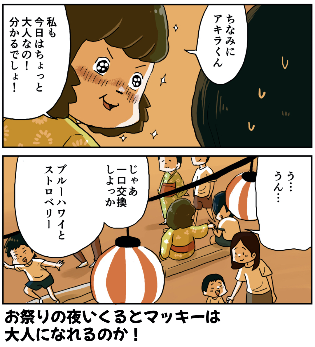男子と一緒に行きたい夏祭り(その5 後編) 2022年07月29日 男子と行きたい夏祭り編を最初から読む 前の話 次回に続く 次の話 ラインで更新をお知らせできます!登録してね!【お知らせ!】『しなのんちのいくる』書籍化決定!!!書籍限定書き下ろしストーリーも多数収録!さらによゐこ濱口さんとコラボ漫画収録! 読みやすくまとめました是非他の作品も読んでみてください まだまだ続くよ!フォロワーさんがガチで選んでくれた好きな話おすすめの長編もあります是非読んでみてください! 「マッキー」カテゴリの最新記事 < 前の記事次の記事 > コメント コメント一覧 (24) 1. (〃ω〃) 2022年07月29日 17:49 甘ずっぺぇなあ💕💕 0 仲曽良ハミ がしました 9. (・ω・) 2022年07月29日 19:02 >>1 なあ(//∇//)ずっぺぇずっぺぇ 0 仲曽良ハミ がしました 2. よっしー 2022年07月29日 17:52 いつも後ろから蹴ったり、膝カックンしてくる女子が手を繋ぎたいとか浴衣どう?とか聞いてきて最初はキモいとか思ったけど帰り道は満更でもなかったなぁ(笑) 0 仲曽良ハミ がしました 3. わお 2022年07月29日 17:52 やっぱり女の子はマセてるよな笑笑 小学生のガキンチョでもお祭りって雰囲気だけで確かに女になってたわ…笑笑 0 仲曽良ハミ がしました 4. たぬき 2022年07月29日 17:53 フウちゃん、意外に肉食女子!🤣 0 仲曽良ハミ がしました 5. たけ 2022年07月29日 18:00 ふうちゃぁぁぁぁん! 行け、いい女‼️ 0 仲曽良ハミ がしました 6. フィガロ 2022年07月29日 18:03 フゥちゃんの攻めの姿勢が少し心配になってしまった😅 0 仲曽良ハミ がしました 7. 寿司🍣 2022年07月29日 18:12 しなの&ナッちゃんといくるマッキーがばったり会いませんように😅 0 仲曽良ハミ がしました 8. 昭和50年生まれ 2022年07月29日 18:31 フウちゃんタイプの女の子は意外に肉食だし、結婚も早かった印象がある笑 0 仲曽良ハミ がしました 18. QB 2022年07月30日 09:11 >>8 おもひでぽろぽろでもちょっと太った子が早く結婚していたとかあったねー。 0 仲曽良ハミ がしました 10. (o^^o) 2022年07月29日 20:16 その頃しゅうは…😂 0 仲曽良ハミ がしました 11. ぐっっ 2022年07月29日 20:33 ふぅちゃんやるなぁ、、🎇 0 仲曽良ハミ がしました 12. しやわ 2022年07月29日 20:39 ナッちゃん「えぇ…フウちゃんここでいくるマッキーの名前だすのん完全にアカンなるフラグやん」 0 仲曽良ハミ がしました 13. ジェダイの騎士 2022年07月29日 22:55 フウちゃんせめるね 0 仲曽良ハミ がしました 14. S52 2022年07月30日 02:06 いいなあ なぜ俺はずっと男子校だったんだろう 楽しかったけどさ 0 仲曽良ハミ がしました 15. きゃー!!! 2022年07月30日 08:34 かわいいいいいいいいいいいいいいいいいいい! 0 仲曽良ハミ がしました 17. 椎名ちゃん 2022年07月30日 09:08 そうか、フウは今日 ちょっぴり大人パンツ(FF7)をはいてきたのか ( • ̀ ∀• ́ ) 0 仲曽良ハミ がしました 19. 2022年07月30日 09:13 ここでナッちゃん投入!! は、無いのかな 0 仲曽良ハミ がしました 20. だいこんさん 2022年07月30日 09:44 このくらいの歳の時は男子より女子の方が常に大人。悪く言っちゃうとこの歳の男子は圧倒的におバカが多い。男子は周り関係なく自分がいかに楽しめるかを追求してる。その結果悪ふざけが過ぎて怒られたり嫌われたりしてしまう年頃ですね。 ブルーハワイもなんとなく青だし響きがカッコいいから頼んでたなぁ。うろ覚えだけどパイナップルと夏の果物(ド忘れ)のミックス味だと知ったのは大人になってからだったな。 0 仲曽良ハミ がしました 21. 2022年07月30日 10:48 >>20 パイナップルとレモンだね 0 仲曽良ハミ がしました 22. みー 2022年07月30日 17:14 アキラくん‥タジタジ😅 意外とマッキー好きだったりして😏 0 仲曽良ハミ がしました 23. さなえ 2022年07月31日 00:35 ふうちゃんの熱い鼻息をかんじるわ…。 0 仲曽良ハミ がしました 24. いとさん 2022年08月01日 15:52 小学校の時、似たシチュエーションで好きな子と2人きりになった時、横に歩くのが恥ずかしくて、その子の前を歩いてた甘酸っぱくも懐かしい記憶が頭の片隅から出てきた。 0 仲曽良ハミ がしました 25. 2022年08月02日 18:14 >>24 あなたのそのショートストーリーも立派な漫画になりそう 0 仲曽良ハミ がしました コメントフォーム 名前 コメント 記事の評価 リセット リセット 顔 星 情報を記憶 コメントを投稿する