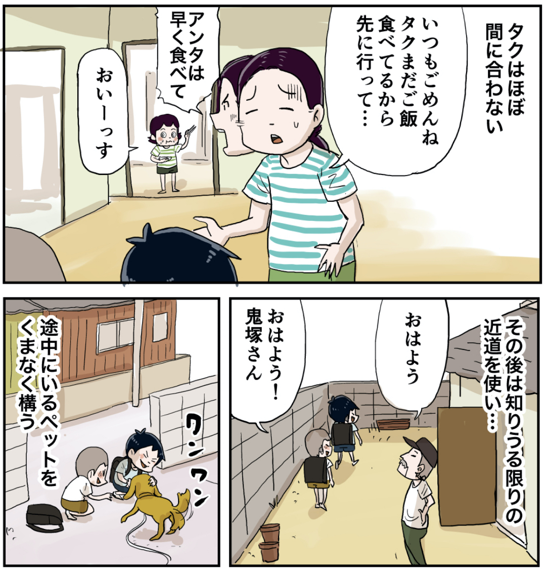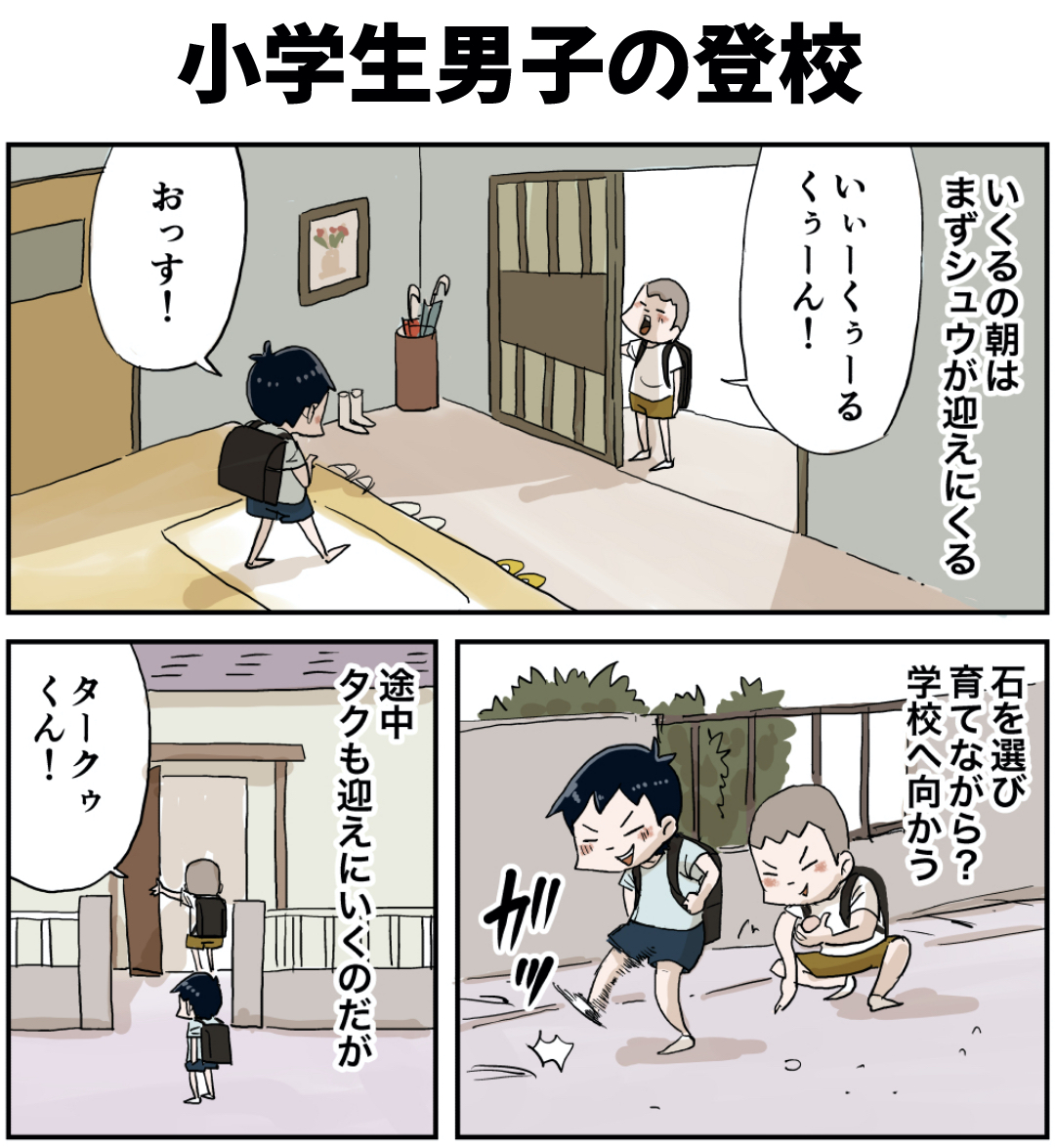 小学生男子の登校 2022年08月23日 前の話 遊びたいことが沢山で忙しいんです! 次の話 ラインで更新をお知らせできます!登録してね!【お知らせ!】『しなのんちのいくる』書籍化決定!!!書籍限定書き下ろしストーリーも多数収録!さらによゐこ濱口さんとコラボ漫画収録! 読みやすくまとめました是非他の作品も読んでみてください まだまだ続くよ!フォロワーさんがガチで選んでくれた好きな話おすすめの長編もあります是非読んでみてください! 「いくる(弟)」カテゴリの最新記事 < 前の記事次の記事 > コメント コメント一覧 (26) 1. たぷたぷあざらし 2022年08月23日 18:50 寄り道しないで、早めに登校して、友だちと氷鬼してたなぁ 私たちの学年が、あまりに早く来るから、門を開ける教頭先生に遅くくるようにって、プリント配られた 0 仲曽良ハミ がしました 5. うちなんちゅ 2022年08月23日 19:04 >>1 うちの子の小学校も、かなり早く学校に来る子がいるそうで、7:45以降に登校するようにとプリントが配られてました😅 0 仲曽良ハミ がしました 2. らくだまる 2022年08月23日 18:52 石育て、やりましたね!全国共通の遊びだったんですね。 0 仲曽良ハミ がしました 21. 今も 2022年08月24日 07:14 >>2 石を見るとついやっちゃうww 0 仲曽良ハミ がしました 3. ヤマタノオロチ 2022年08月23日 18:52 次回は学校帰り道だねwww 0 仲曽良ハミ がしました 4. 今夜はそぼろ丼 2022年08月23日 18:53 ちょっと言葉悪いけど 男の子ってバカで可愛いなぁw 0 仲曽良ハミ がしました 6. そうた 2022年08月23日 19:10 放課後ならまだしも朝から道草食ってるのはマズイな🤣 0 仲曽良ハミ がしました 7. ナガレビト 2022年08月23日 19:11 うちの地区は集団登校だったから、少人数での登校に少し憧れたなぁ 0 仲曽良ハミ がしました 8. Kbee 2022年08月23日 19:16 毎回めちゃくちゃ面白い🤣 0 仲曽良ハミ がしました 9. salvia 2022年08月23日 19:23 こういう(面白い)子がいるから、集団登校っていうのが出来上がっていったのでしょうね♪ 0 仲曽良ハミ がしました 10. junkrocky 2022年08月23日 19:24 石蹴りは帰りの遊びだったな、なんでたろ? あ、集団登校だったからだ😵💫 6年生には逆らえなかった😵 0 仲曽良ハミ がしました 11. さくら 2022年08月23日 19:24 小学生男子あるあるw しかも学校から近い子ほど遅刻しがち、遠い子は登校するまでが大変だから。 0 仲曽良ハミ がしました 24. さくら 2022年08月25日 21:05 >>11 そういえば今気が付いた。 タク君とタクママ同じTシャツ着てる! 0 仲曽良ハミ がしました 12. キタさん 2022年08月23日 19:29 タクママのメガネは? 0 仲曽良ハミ がしました 13. たぬき 2022年08月23日 20:07 「◯◯ちゃん〜、◯◯く〜ん、遊びましょ〜!」お友達の家に行くと玄関先でみんなこんな感じで大声で呼んでいたなぁ😌インターホンなんてなかったし😅 0 仲曽良ハミ がしました 14. おもしろいです 2022年08月23日 20:21 俺は間に合わないタクのポジションだったなー ごめんよー俺の当時の友達〜今考えるともったいないなー 0 仲曽良ハミ がしました 15. ナナキ 2022年08月23日 21:24 マッキーきゃわわ 0 仲曽良ハミ がしました 16. 寿司🍣 2022年08月23日 22:56 石育て分かるわ〜笑 0 仲曽良ハミ がしました 17. 仲曽良さんいつもありがとう 2022年08月23日 23:34 日直とか寝坊しないようにソワソワして人の目を気にする性格だったからイクル君達のように自由気ままに過ごしているのが羨ましい! マッキーゴメンね💦 0 仲曽良ハミ がしました 18. 早起き男子 2022年08月24日 00:04 たくちゃんは、どのタイミングで教室に入っているのだろう? 中学生の姉ちゃんより、早く家を出る小学生……お~い、朝からどんだけ遊ぶんだ~と吹いてしまいました! いくるが家を出ると、お母さんは、「今日も元気に行った!よかった!」とホッと一息ついていそうですね。 0 仲曽良ハミ がしました 19. あさり 2022年08月24日 01:22 タクちゃんが始業に間に合ったのか気になる〜! 0 仲曽良ハミ がしました 20. つん子 2022年08月24日 02:17 いや、さすがにその道草はないわぁ~ 0 仲曽良ハミ がしました 22. カツヲ 2022年08月24日 09:16 ちゃっかり鬼塚さん家通れるぐらい仲良くなったんだなぁ~!😁 0 仲曽良ハミ がしました 23. だいこんさん 2022年08月25日 07:55 自分もひとりで歩いたら10分程度の距離を友達と50分くらいかけて登校してたなぁ。 石でサッカーしたり、白線や影以外歩いちゃいけない縛りだったり、どこか立ち寄ったり、信号点滅で渡ろうと待ってみたりといろいろと遊びながら登校してました。 それと合わせて、やっぱり待ち合わせの時間までに出てこなかったりと最後は走るはめになる。そしてポッチャリしてる友達が「待ってくれ~」何て言って走りたいのに止まって待たなきゃだったりとちょこちょこ遅刻になったりもしました。 余談ですが自分が待ち合わせの時間に遅れそうになり、先に行ってて貰うと友達よりも先に登校するなんて珍現象も何度かあり、「遅れそうとか嘘じゃん」なんてチクりと言われたりもしました。イヤイヤ君たち遊びな