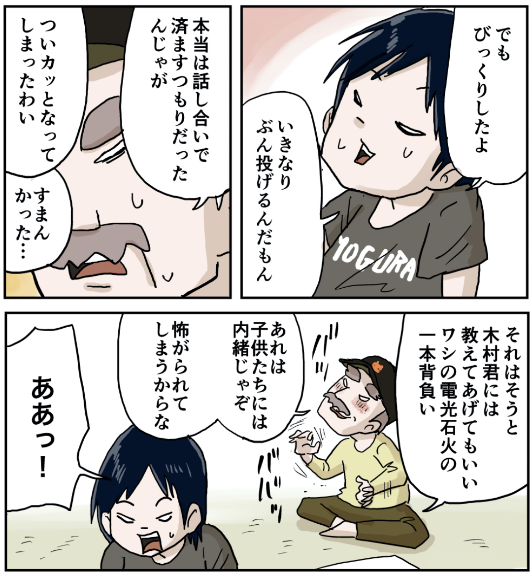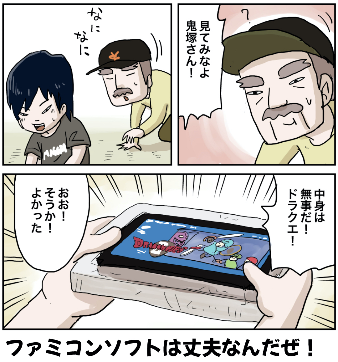 木村君(その12 後編) 2022年09月24日 「木村君」編を最初から読む 前の話 ラインで更新をお知らせできます!登録してね!【お知らせ!】『しなのんちのいくる』書籍化決定!!!書籍限定書き下ろしストーリーも多数収録!さらによゐこ濱口さんとコラボ漫画収録! 読みやすくまとめました是非他の作品も読んでみてください まだまだ続くよ!フォロワーさんがガチで選んでくれた好きな話おすすめの長編もあります是非読んでみてください! 「木村君」カテゴリの最新記事 < 前の記事次の記事 > コメント コメント一覧 (32) 1. すずきん 2022年09月24日 16:16 やったぜ! 0 仲曽良ハミ がしました 2. トピ 2022年09月24日 16:18 ドラクエ、壊れてなくて良かった。😅 0 仲曽良ハミ がしました 3. まぼ 2022年09月24日 16:18 ファミコンのカセットって 本当丈夫よね なのに ちょっとのことでセーブデータ消えるのは 勘弁してほしい 3つセーブデータあって 兄貴が2人 自分のがデータが消えるのは まだ最悪だけど致し方ないが 自分がやろうとして あの音楽で兄貴のデータ消えたら シ、、ヌ、、 0 仲曽良ハミ がしました 19. うちなんちゅ 2022年09月24日 18:29 >>3 私はスーファミ世代ですが… ゲームスタートした時、あの音楽がなった時の絶望感ヤバいですよね… 思いっきりトラウマになってしまって、Switchでドラクエやってる時もあの音楽鳴らないかビクビクしてしまいます(;´∀`) 0 仲曽良ハミ がしました 24. ふ 2022年09月24日 22:16 >>3 この漫画のカセットはドラクエ2 セーブは復活の呪文だから大丈夫! とは言え… 呪文の記述ミスで「じゅもんが ちがいます」 と表示された時のあの絶望感は同じですね… 0 仲曽良ハミ がしました 28. だいこんさん 2022年09月25日 09:45 >>24 当時は自分の書き写しミスだと思えず(認めず?)パスワードに偽物が紛れてる場合があると思い込み「偽物掴まされたっ」と偽物パスワード混ぜるなんて最低だと思ってた。 0 仲曽良ハミ がしました 29. QB 2022年09月25日 13:42 >>28 ところがドラクエ2は時折入らないパスワードが生成されてしまうという事象がおきるという厄介なことが偶々にあったという。 0 仲曽良ハミ がしました 4. さくら 2022年09月24日 16:18 よかったなあ 0 仲曽良ハミ がしました 5. マリ 2022年09月24日 16:27 お二人もドラクエもご無事で何より٩( 'ω' )و 0 仲曽良ハミ がしました 6. kyakya 2022年09月24日 16:28 よかったー 鬼塚さん、早速ドラクエ教えてもらってね👍 0 仲曽良ハミ がしました 7. まさ〜ん 2022年09月24日 16:33 さぁ、障害は切り抜けられた! ドラクエ名物勇者の名前付け…おにつ゛か…では名前が入りきらないなぁ? 鬼塚さん、勇者の名前はどうするんだろうなぁ(ニヤニヤ) 0 仲曽良ハミ がしました 30. 椎名ちゃん 2022年09月25日 13:44 >>7 もちろんローレシアは もょもと でプレイ (えー 0 仲曽良ハミ がしました 8. 昭和50年生まれ 2022年09月24日 16:40 ドラクエ2発売日に呑気におもちゃ屋へ買いに行ったけど、何処にも売ってなくて泣いた思い出があるわ。 予約が必要になったのってこの位だったよね。 3は前の年の夏頃予約したわ(発売日1988年2月10日) 0 仲曽良ハミ がしました 9. もとむら 2022年09月24日 16:43 カセットが無事で良かった反面、あの子たち普通にやばいだろと思う( ˙-˙ ) 結構高価でしょう??それを簡単に踏むなんて… 0 仲曽良ハミ がしました 10. 52 2022年09月24日 16:51 今気づいたが、DQ2はパスワードだし難易度鬼だし、じーちゃんじゃ無理や。 そういう意味でも続きだ楽しみ 0 仲曽良ハミ がしました 11. ゆうみ 2022年09月24日 16:54 ファミコン本体は大丈夫?壊れやすいイメージがあるからヒヤヒヤしてました😂いや、カセットとの接触が悪かっただけかな🤣 0 仲曽良ハミ がしました 12. うら 2022年09月24日 16:54 当時でも暴力は許されないと 建前上は言ってたけど、 なんだかんだで、緩かったですね! 気持ちのよいマンガをありがとうございます! 0 仲曽良ハミ がしました 13. まつん 2022年09月24日 17:12 木村くんが鬼塚さんに心を開いていくのがわかって、ほっこりする! 0 仲曽良ハミ がしました 14. そうた 2022年09月24日 17:14 いくらファミコンソフトがある程度丈夫といえど人が故意に踏む重荷に対しての耐久性は無いだろう。って事は実はあの上級生達は手加減してたのかな?なのに一本背負いや背中蹴りはちとやり過ぎだったかも。だとしても下級生&ジジイに3人がかりは卑怯そのものではあるが。 0 仲曽良ハミ がしました 31. りぃ 2022年09月25日 14:28 >>14 以前からしつこく木村くんにつきまとい喧嘩売る人に対しては、何をしてもいいのだ! …とは思わないけれど、問答無用で喧嘩売る相手に悠長に話し合いなんか無理でしょうし、あのままだと木村くんはまたタコ殴りされますし。やり過ぎじゃない抵抗って何でしょうか。 力のない愛は無力、愛のない力は暴力、ということばがあります。 鬼塚さんのふるったのは、愛ゆえの力だと思います。 0 仲曽良ハミ がしました 15. 196 2022年09月24日 17:21 ちゃんと「鬼塚さん」て名前呼んでる😭 0 仲曽良ハ