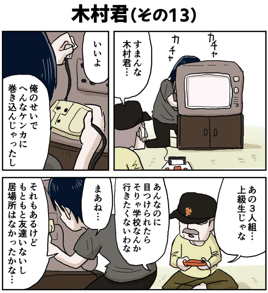 木村君(その13 前編) 2022年09月25日 「木村君」編を最初から読む 前の話 さあ、木村君あとは君次第だ! ラインで更新をお知らせできます!登録してね!【お知らせ!】『しなのんちのいくる』書籍化決定!!!書籍限定書き下ろしストーリーも多数収録!さらによゐこ濱口さんとコラボ漫画収録! 読みやすくまとめました是非他の作品も読んでみてください まだまだ続くよ!フォロワーさんがガチで選んでくれた好きな話おすすめの長編もあります是非読んでみてください! 「木村君」カテゴリの最新記事 < 前の記事次の記事 > コメント コメント一覧 (22) 1. 白 2022年09月25日 15:03 大丈夫優しい 0 仲曽良ハミ がしました 2. 紗菜(20歳です) 2022年09月25日 15:09 女子大生ですが、この作品が大好きで、毎日欠かさず読んでいます! 鬼塚さんの優しさと木村くんに対する勇気づけに心動かされました。 前から気になっていたのですが、この作品の舞台は、ドラクエ2やその他流行っていたものなどから判断すると、1987年ですか〜? 0 仲曽良ハミ がしました 3. カラテカ 2022年09月25日 15:10 俺もいい大人になってから知った 意外と社会や世間は優しい 0 仲曽良ハミ がしました 4. マーブル 2022年09月25日 15:21 本当に思う そして自分も人に優しくなればそんな人がドンドン集まってくる そしてそうでない人も優しくなれる と信じてる 0 仲曽良ハミ がしました 5. かときち 2022年09月25日 16:16 さすが経験者のお言葉は説得力がある‼︎ 木村くんの心がちょっとずつ溶けてきてる‼︎ 鬼塚じいちゃん、頑張れ‼︎😆 0 仲曽良ハミ がしました 6. ペルポイ 2022年09月25日 16:22 また泣かされたわー。なんか世の中的に『昭和生まれのおっさん』ってどんどん肩身の狭い存在になりつつあるけど、みんな頑張ろうな。 0 仲曽良ハミ がしました 12. r 2022年09月25日 17:28 >>6 おばさんも頑張ります! 0 仲曽良ハミ がしました 7. しの 2022年09月25日 16:36 号泣💧💧💧 0 仲曽良ハミ がしました 8. 猫助 2022年09月25日 16:57 じいさん、良いこと言うなぁ 年の離れた友情だもんね 0 仲曽良ハミ がしました 9. 猫助 2022年09月25日 16:58 じいさん、良いこと言うなぁ 年の離れた友情だもんね 0 仲曽良ハミ がしました 10. よしたく 2022年09月25日 17:22 だめだ、もう泣きそう。。。(T ^ T) 0 仲曽良ハミ がしました 11. FF 2022年09月25日 17:23 「ワシと友達になった気分は?」「来てくれて嬉しかったぞ」 中々口に出来ない事をさらりと言う鬼塚さん素敵。 面と向かって言われると木村君もはねつけるだろうが、 ファミコン配線しながらなら思わず素直に聞いちゃうよね。 0 仲曽良ハミ がしました 13. ぴぴろち 2022年09月25日 17:39 あぁ、もぅ、愛おしい、この二人、愛おしい 涙でるよ ほんとにいい話だなぁ 0 仲曽良ハミ がしました 14. 寿司🍣 2022年09月25日 18:28 それはなんとなくわかったけどさ この一言に全てが詰まってる気がする 0 仲曽良ハミ がしました 15. なおピン 2022年09月25日 18:30 (" ॑꒳ ॑" )ウンウン 難しい年頃だから わかるわかる あと1歩踏み出そう 0 仲曽良ハミ がしました 16. kyakya 2022年09月25日 18:32 鬼塚さんみたいな大人 昔はいっぱいいた気がする 0 仲曽良ハミ がしました 17. y 2022年09月25日 19:25 本当に優しい世界ですね。 現実でもこんな風に関わり合えて、そして素直にわかった気がすると思ってくれるならいいのになぁ。 0 仲曽良ハミ がしました 18. しなのファン 2022年09月25日 21:41 恥ずかしくてTVに隠れちゃう木村クン可愛いぢゃない! なんかイイ展開ですね♪ 0 仲曽良ハミ がしました 19. かしいさえ 2022年09月25日 21:58 木村くん、素直に思ったことを言えるようになってきたね😆 0 仲曽良ハミ がしました 20. シャーマンカーン 2022年09月25日 22:10 涙が止まらない 0 仲曽良ハミ がしました 21. はる 2022年09月26日 10:26 じいちゃん、コントローラーずっと持ってて可愛い♥️ 木村くんに響いてるだろうな。 頑張れ木村くん! 0 仲曽良ハミ がしました 22. 士土菱康 2023年06月02日 08:52 反応がすげー広告がすげー アレが臭い人用の薬のや~つ 忘れてたトラウマ、又発掘出来ました ありがとう 0 仲曽良ハミ がしました コメントフォーム 名前 コメント 記事の評価 リセット リセット 顔 星 情報を記憶 コメントを投稿する