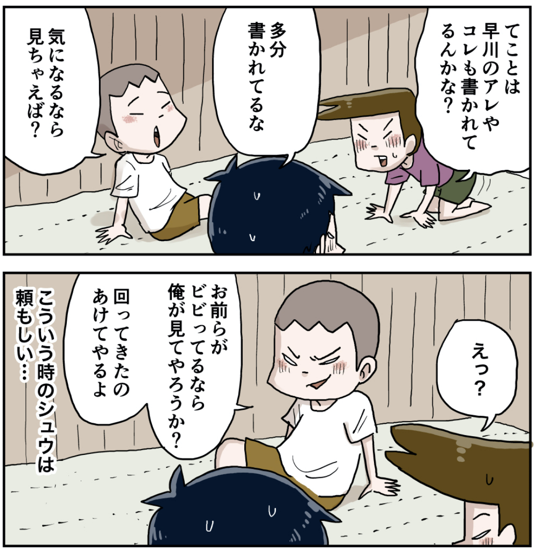 秘密文書(その2) 2022年10月05日 前の話 おいおいシュウヘッドが欲しいからって大丈夫か? ラインで更新をお知らせできます!登録してね!【お知らせ!】『しなのんちのいくる』書籍化決定!!!書籍限定書き下ろしストーリーも多数収録!さらによゐこ濱口さんとコラボ漫画収録! 読みやすくまとめました是非他の作品も読んでみてください まだまだ続くよ!フォロワーさんがガチで選んでくれた好きな話おすすめの長編もあります是非読んでみてください! 「いくる(弟)」カテゴリの最新記事 < 前の記事次の記事 > コメント コメント一覧 (19) 1. なす 2022年10月05日 16:41 みつるはわかるけど、いくるも気になるようになったんだね!マッキーだろうなあ。 0 仲曽良ハミ がしました 2. 寿司🍣 2022年10月05日 16:41 シュウ、お主も悪よのぉ 0 仲曽良ハミ がしました 3. サタンマリア 2022年10月05日 16:43 これ、、早川さんがいくるって書いてあったら地獄絵図、、(笑) 0 仲曽良ハミ がしました 4. ちむちむ 2022年10月05日 16:43 ちょっと、あんた達、大丈夫?返り討ちにあいませんように。 0 仲曽良ハミ がしました 5. コーナ 2022年10月05日 16:45 嫌な予感しかしない。(笑) 0 仲曽良ハミ がしました 6. windu 2022年10月05日 16:47 こういう時に一番頼もしいのタクだと思ってた。タクなら普通に見そう。 0 仲曽良ハミ がしました 7. そうた 2022年10月05日 16:58 シュウが半殺しされる未来しか見えない😎 0 仲曽良ハミ がしました 8. junkrocky 2022年10月05日 17:05 こ、これはしなのにもバレて大惨事かっ💦💦💦 0 仲曽良ハミ がしました 9. ペンペン草 2022年10月05日 17:19 パンドラの匣 0 仲曽良ハミ がしました 10. 負けないもん! 2022年10月05日 17:33 ベビタピ行きたい 0 仲曽良ハミ がしました 11. えみ 2022年10月05日 17:47 怖い怖い🫣です 0 仲曽良ハミ がしました 12. ノブ 2022年10月05日 19:12 いくるとシュウの関係が、ジョジョの仗助と億泰みたい(笑) 0 仲曽良ハミ がしました 13. へっどぉ 2022年10月05日 19:54 シソジュラはともかくとして、ヘッドロココはやべえだろ。 どれだけ価値があると思ってるんだ。 0 仲曽良ハミ がしました 14. 鳴海 2022年10月05日 20:19 悪い予感しかしない( ̄▽ ̄;) 0 仲曽良ハミ がしました 15. ongakuzaru 2022年10月05日 20:51 し、始祖ジュラに、 へ、ヘッドロココだと! 吹っ掛けすぎ・・・、 イヤ、それほどガチな任務ですな! 0 仲曽良ハミ がしました 16. (笑) 2022年10月06日 03:12 先の展開がめっちゃ楽しみです(笑) わちゃわちゃの大騒ぎになりそうな気配🤣🤣 0 仲曽良ハミ がしました 17. うら 2022年10月06日 12:06 尽力して紙を広げた結果。 「昨日の夜、なに食べた?」 0 仲曽良ハミ がしました 18. ちくわ 2022年10月06日 13:14 リスクのわりに書いてある内容は薄いんだよねw 0 仲曽良ハミ がしました 19. 魚くんちゃんさん 2023年05月09日 23:05 危険な男だぜシュウ。 この爆弾野郎が…。 0 仲曽良ハミ がしました コメントフォーム 名前 コメント 記事の評価 リセット リセット 顔 星 情報を記憶 コメントを投稿する