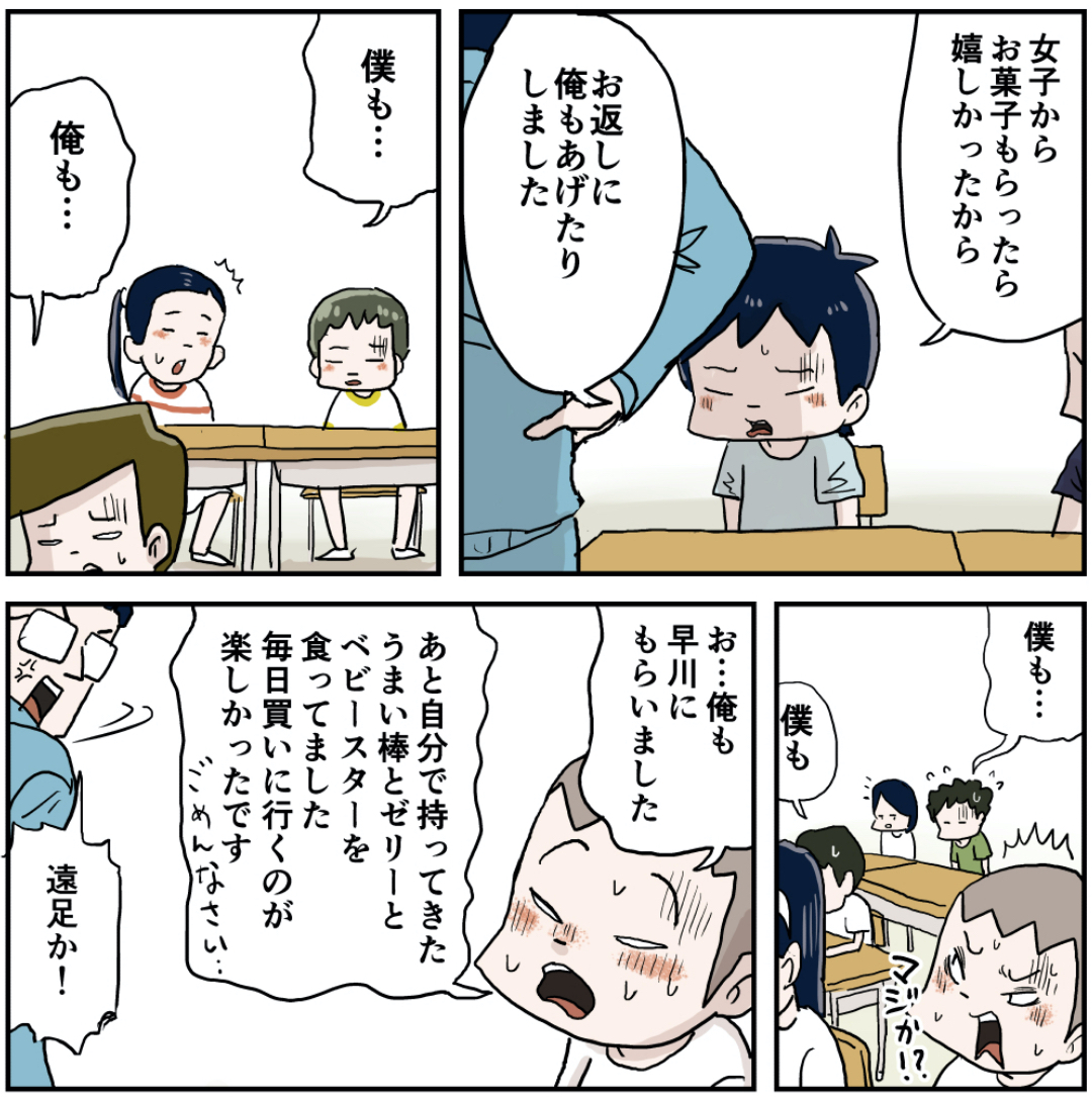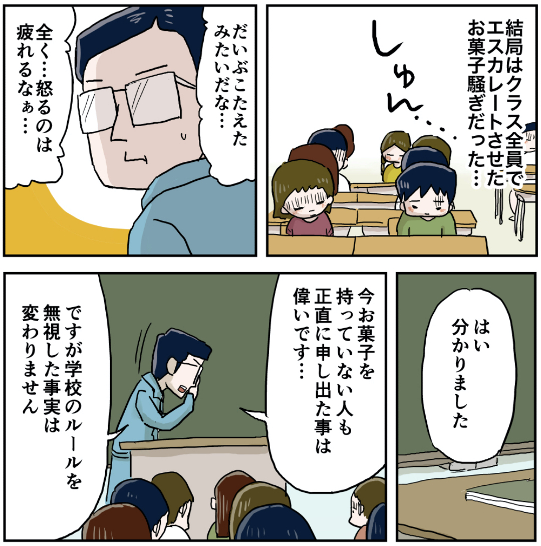 席替え(その11) 2022年11月02日 席替え編を最初から読む 前の話 お説教は先生も疲れるよね… ラインで更新をお知らせできます!登録してね!【お知らせ!】『しなのんちのいくる』書籍化決定!!!書籍限定書き下ろしストーリーも多数収録!さらによゐこ濱口さんとコラボ漫画収録! 読みやすくまとめました是非他の作品も読んでみてください まだまだ続くよ!フォロワーさんがガチで選んでくれた好きな話おすすめの長編もあります是非読んでみてください! 「先生」カテゴリの最新記事 < 前の記事次の記事 > コメント コメント一覧 (12) 1. アラフィフ 2022年11月02日 20:39 「罰として掃除」昭和の学校あるあるですね。大人になって思うのは、 いまだに、掃除を好きになれず、 モチベーションが上がらない家事です。 0 仲曽良ハミ がしました 8. あちゃへい 2022年11月03日 07:26 >>1 それ 0 仲曽良ハミ がしました 10. QB 2022年11月03日 08:05 >>1 でも掃除って最も大切なこととして僧侶が重きをおく修行でもあるんだよね 0 仲曽良ハミ がしました 2. FF 2022年11月02日 21:07 先生、怒らざるを得ない立場だからね、大変だね。 でもクラスのまとまりは嬉しいはず、 今回の件でなにを思ったか早く知りたい! 0 仲曽良ハミ がしました 3. しの 2022年11月02日 21:34 先生のお話の続きにとっても期待しています。 きっと子どもたちの気持ちに寄り添ってくれる素敵な言葉を伝えてくださるはず💕 こういう大人と出会った子どもたちは、たぶん幸せに成長するんだよ💕 0 仲曽良ハミ がしました 4. にゃーんだ 2022年11月02日 22:20 先生、どうか寛大な配慮を! 彼らは正直に申し出たのですから。 0 仲曽良ハミ がしました 5. アメとムチぃ 2022年11月02日 22:58 体育館のモップがけ! 昔、掃除で遊んでて猛烈に怒られた時に、一人で体育館のモップがけやらされた。 汗が滝のように出たわ。 今だったら、パワハラ?になるのかな。 0 仲曽良ハミ がしました 6. ペルポイ 2022年11月02日 23:10 いい流れの中でもシュウがしっかり役割を果たしてるの好き 0 仲曽良ハミ がしました 7. kyakya 2022年11月02日 23:55 自分の気分次第で怒る先生とは大違いの めっちゃイイ先生やん 0 仲曽良ハミ がしました 9. はらぺこ 2022年11月03日 07:28 特に先生の回は自分の子供への伝え方とかの勉強になるからすごい読む 0 仲曽良ハミ がしました 11. みやも 2022年11月03日 09:09 実際は、食べないでイイコにしてた子が「えー!食べてないのに!!」って文句言い出すんだろう。連帯責任。 0 仲曽良ハミ がしました 12. ナガレビト 2022年11月03日 16:59 自分がいくるの歳に巡り遭った(あえてこう書く)担任は何か気に入らない事があればすぐに手が出てくる中年女性でした。 30年以上経った今でも正直恨んでます。 いくるの担任の様な人に受け持ってもらいたかったです。 0 仲曽良ハミ がしました コメントフォーム 名前 コメント 記事の評価 リセット リセット 顔 星 情報を記憶 コメントを投稿する