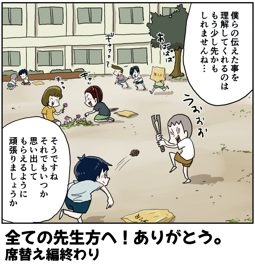 席替え(その13) 2022年11月04日 席替え編を最初から読む 前の話 ラインで更新をお知らせできます!登録してね!【お知らせ!】『しなのんちのいくる』書籍化決定!!!書籍限定書き下ろしストーリーも多数収録!さらによゐこ濱口さんとコラボ漫画収録! 読みやすくまとめました是非他の作品も読んでみてください まだまだ続くよ!フォロワーさんがガチで選んでくれた好きな話おすすめの長編もあります是非読んでみてください! 「先生」カテゴリの最新記事 < 前の記事次の記事 > コメント コメント一覧 (15) 1. ナガレビト 2022年11月04日 18:14 この先生何気に学級経営能力高いね。 一度職員室での日常がスポットされたシリーズが読みたいです。 0 仲曽良ハミ がしました 2. あ 2022年11月04日 18:15 た為のになってらっしゃる 0 仲曽良ハミ がしました 3. たぬき 2022年11月04日 18:37 大人になった私には充分わかりますよ ありがとう先生😭💦 0 仲曽良ハミ がしました 4. にゃーんだ 2022年11月04日 18:45 寛大な配慮、ありがとうございました。 m(_ _)m 0 仲曽良ハミ がしました 5. 紗菜(20歳です) 2022年11月04日 18:49 この先生の話は胸に沁みるし、生徒の個性を否定することなく良い学級を築き上げているのだな〜と感じました…🥺 最後のコマで、タクとミツルが追いかけっこしているような…仲良くなったのかな?🤔 0 仲曽良ハミ がしました 6. ジェダイの騎士 2022年11月04日 18:57 先生ありがと〜!! 0 仲曽良ハミ がしました 7. どんこ 2022年11月04日 19:12 この学校の先生いいなー。 0 仲曽良ハミ がしました 8. ちむちむ 2022年11月04日 19:32 仲良いからいいんですよ。 0 仲曽良ハミ がしました 9. FF 2022年11月04日 20:59 シュウ、構えが一本足打法じゃん、 うっかり見落とすとこだったw 0 仲曽良ハミ がしました 10. 大ファンの一人 2022年11月05日 03:24 先生、ちゃんと伝わってますよ みんな素直で仲良いもん 0 仲曽良ハミ がしました 11. アラフォー 2022年11月05日 09:40 体育館掃除組の方も遊んでるんだろうなー 追いかけっことかモップで競争とか… 0 仲曽良ハミ がしました 12. f 2022年11月05日 22:00 最終、仲良けりゃOK!! ってか、こんな良い先生に出会った事ないですw 0 仲曽良ハミ がしました 13. 昭和51年生 2022年11月09日 19:00 毎回、最後でホッコリさせて貰ってます 楽しくて優しい漫画をありがとうございます 0 仲曽良ハミ がしました 14. 魚くんちゃんさん 2023年05月09日 23:26 素直で無邪気だけど空気なんて読めないし読まないぞ! がんばれ先生、そしていつもお疲れ様です。 0 仲曽良ハミ がしました 15. べっさん 2023年10月16日 14:57 先生の心、生徒知らず。。。 大人になってから気づくことは本当に多いです。先生ありがとうございました。 0 仲曽良ハミ がしました コメントフォーム 名前 コメント 記事の評価 リセット リセット 顔 星 情報を記憶 コメントを投稿する
