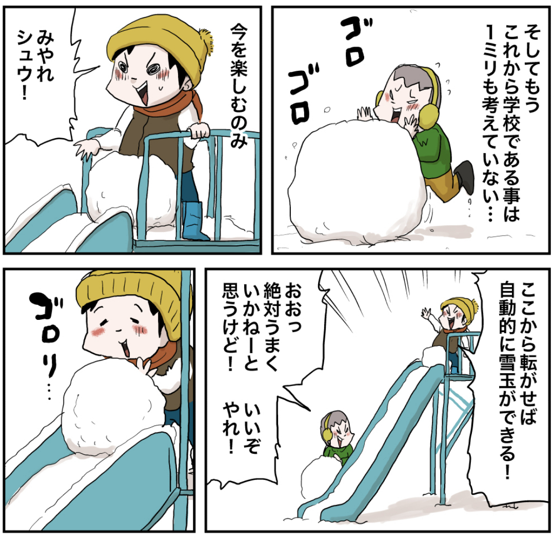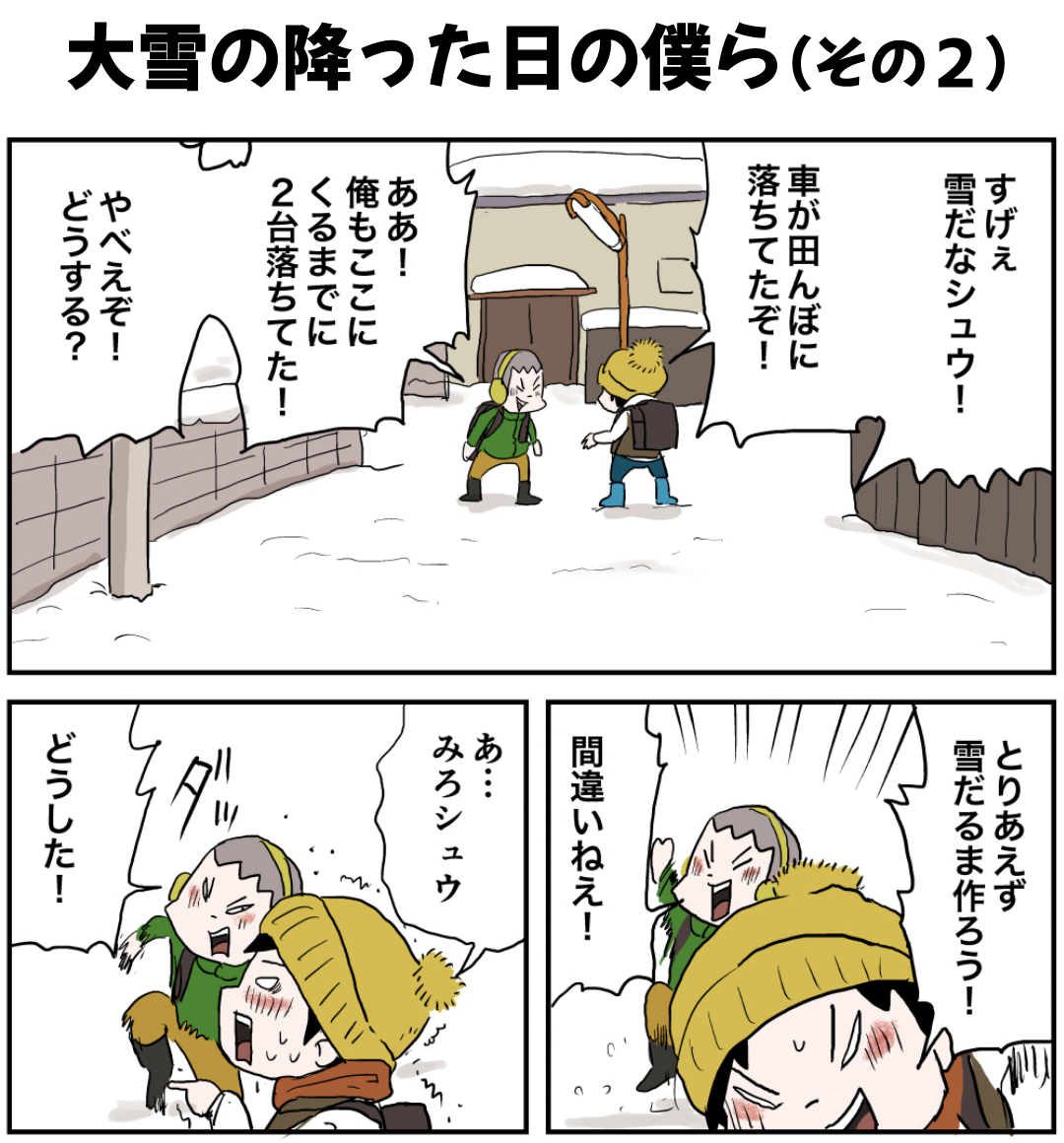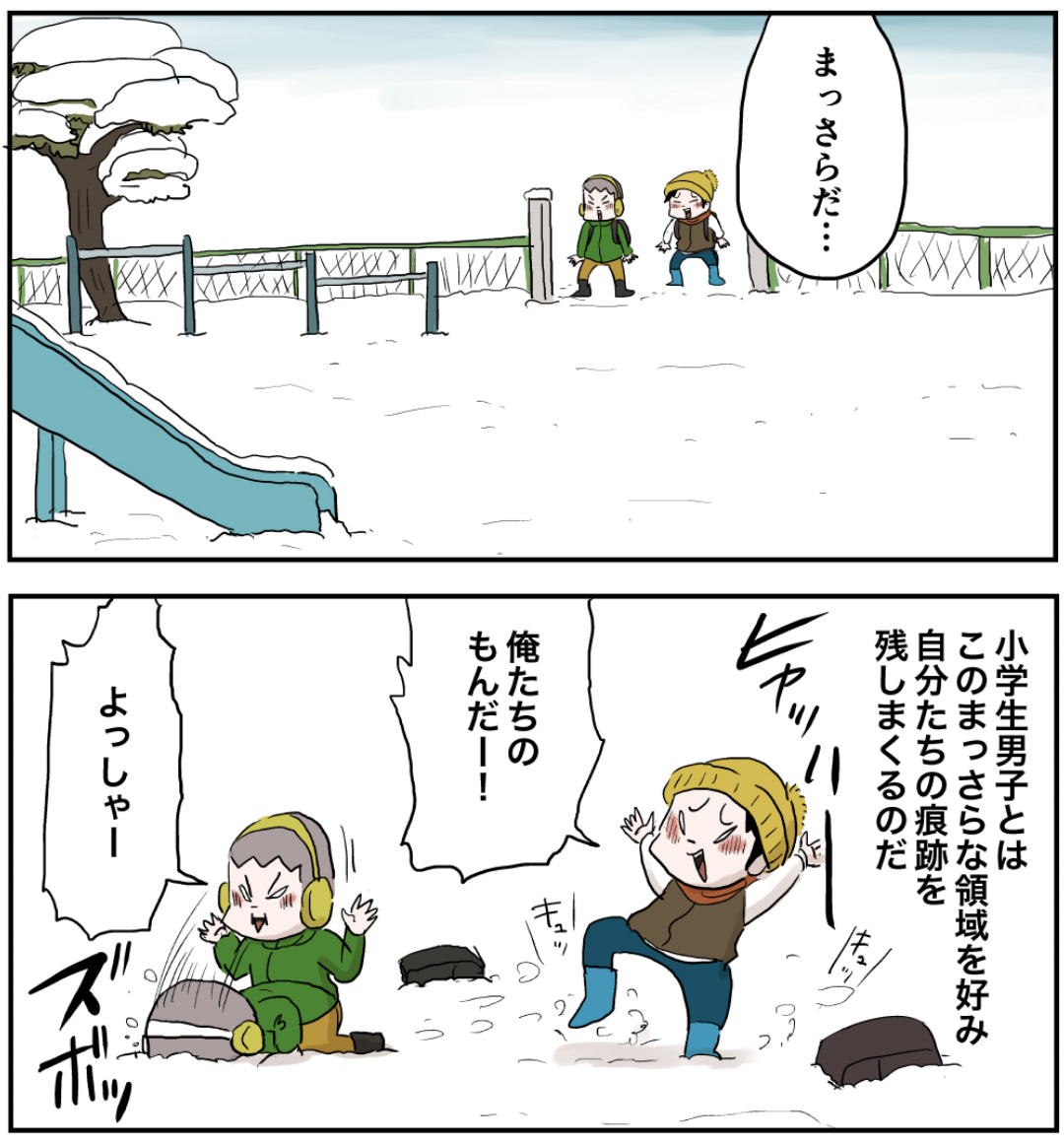 大雪が降った日の僕ら(その2前編) 2022年12月09日 大雪編を最初から読む 前の話 お前ら早よ学校行け… ラインで更新をお知らせできます!登録してね!書籍化決定!!!書籍限定書き下ろしストーリーも多数収録!さらによゐこ濱口さんとコラボ漫画収録! 他の作品も読んでみてね! まだまだ続くよ! 「いくる(弟)」カテゴリの最新記事 < 前の記事次の記事 > コメント コメント一覧 (14) 1. カツヲ 2022年12月09日 15:57 みやろ…😁 0 仲曽良ハミ がしました 2. 寿司🍣 2022年12月09日 15:58 雪降っても学校には行ってたなぁ 授業雪遊びにしてくれる先生とかいた思い出 0 仲曽良ハミ がしました 3. 昭和55年生まれ 2022年12月09日 16:17 雪が嫌いになったという事は 私はオッサンになったという 事ですね・・・・ 0 仲曽良ハミ がしました 4. PIKA 2022年12月09日 16:24 2人共可愛い❤️大好き!! 0 仲曽良ハミ がしました 5. ぴぃ 2022年12月09日 16:32 うん。これは学校どころじゃないよね。 あとで怒られても遊ぶだけの価値はある! 0 仲曽良ハミ がしました 6. ガンプラくん 2022年12月09日 16:39 確かにまっさらの所に足跡つけましたね😆 0 仲曽良ハミ がしました 7. しなのファン 2022年12月09日 19:15 まっさらなの見たら大人になっても痕跡残したくなりますわ🙃 0 仲曽良ハミ がしました 8. くまとり 2022年12月09日 19:59 九州出身なので、雪降ったときテンション爆上がりでしたね。。小学生のとき、授業中止ー!外で遊んでこーい!ってなったのは今でも良い思い出です(後半、足が冷たくなってひたすらガチ泣きしてましたが…笑) いつもの景色が綺麗で、静かで。幻想的でもありました。 毎日読めないときは、まとめて読ませていただいてます〜!応援してます〜! 0 仲曽良ハミ がしました 9. あばば 2022年12月09日 21:25 いーなー雪w 0 仲曽良ハミ がしました 10. 小梅 2022年12月09日 22:36 こりゃ間違いなく遅刻だなぁ、 そして最後はしもやけになっちゃうな! 0 仲曽良ハミ がしました 11. ノブ 2022年12月09日 22:54 学校着く前に遊びすぎて、授業中居眠りしてしまうパターンだな! 0 仲曽良ハミ がしました 12. どんこ 2022年12月09日 23:04 雪降ると長ーい自習(雪遊び)があったなぁ。 先生方お元気かなぁ〜 0 仲曽良ハミ がしました 13. 鳴海 2022年12月10日 08:36 まっさらな雪にを踏むときに鳴る「キュッ」って音が好きやったな 0 仲曽良ハミ がしました 14. 次の回 2023年10月22日 08:44 あっさり学校着いてるのか着くまで3話ぐらいかかるのかw 0 仲曽良ハミ がしました コメントフォーム 名前 コメント 記事の評価 リセット リセット 顔 星 情報を記憶 コメントを投稿する