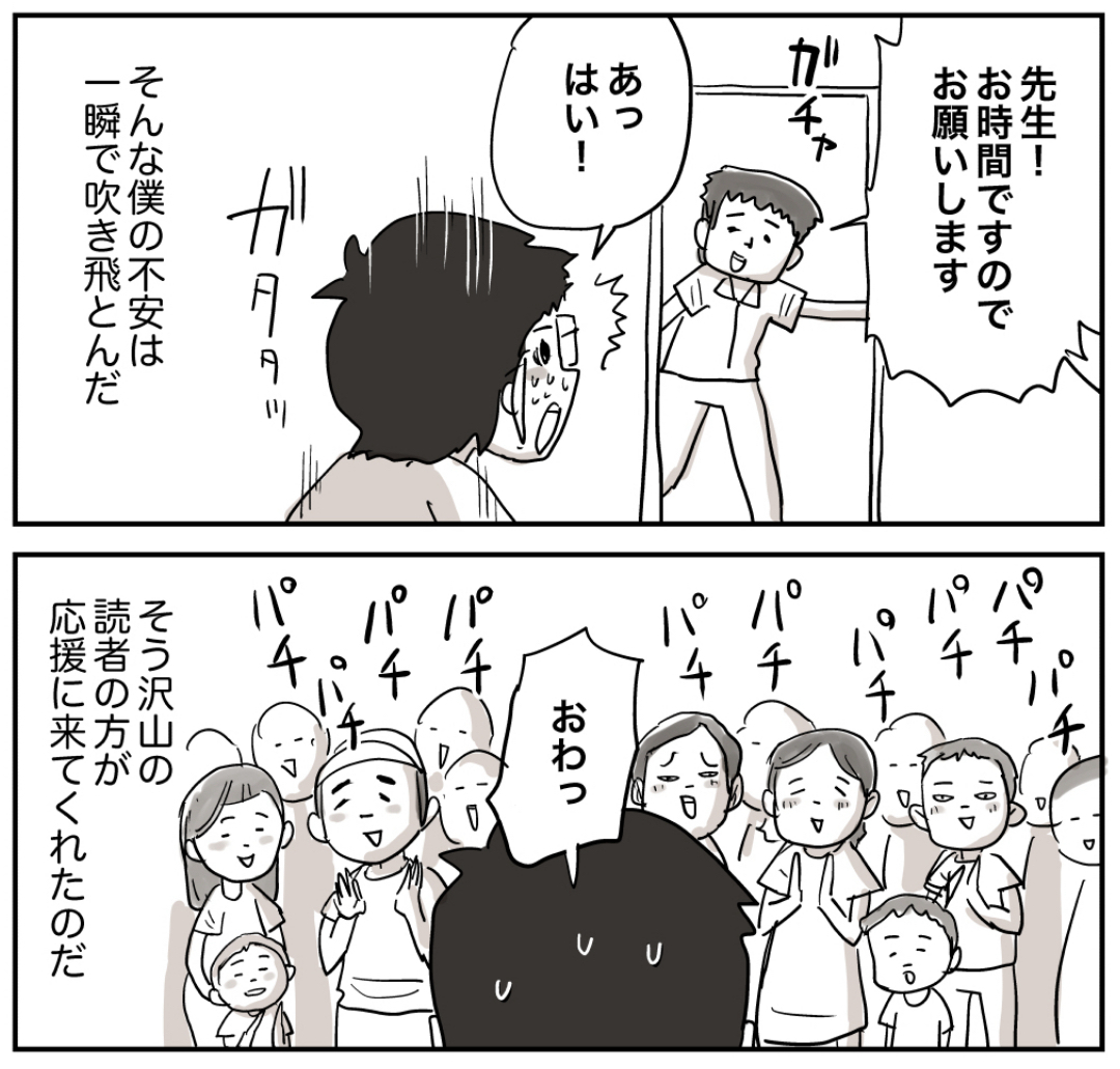 初めてのサイン会 2023年06月24日 初めての方へ登場人物紹介 めっちゃ楽しいサイン会でした!有難うございました! 「しなのんちのいくる」2巻発売しました! 仲曽良の漫画家生活エッセイです無料なので是非読んでみてください。 ラインで更新をお知らせできます!登録してね!作者おすすめの過去作品他の作品も読んでみてね! まだまだ続くよ! 「ハミの日常漫画」カテゴリの最新記事 タグ :#漫画#マンガ#昭和#小学生 < 前の記事次の記事 > コメント コメント一覧 (13) 1. 50年生 2023年06月24日 11:59 おめでとうございます!仕事で行けなかったですが次あったら必ず行きますね。先生とちょっとだけ昔話してみたいですね。 0 仲曽良ハミ がしました 2. たけ 2023年06月24日 12:23 素敵であったかいサイン会、ありがとうございました😊 サービス精神旺盛で、心から「行って良かった」と思えるサイン会でした。 次回はハミ先生をレモンサワーで酔わせる会お願いします❗️ これからも頑張ってください♪ 0 仲曽良ハミ がしました 3. うら 2023年06月24日 12:50 僕も仕事なければ、東京から新潟まて行きたかったですよ! それはともかく、いろんな方の報告を見るに、本当に楽しそうな会になって、それを聞くだけでも嬉しく感じました。 0 仲曽良ハミ がしました 4. はまちゃん 2023年06月24日 12:53 サイン会開催おめでとうございます!私もサイン会行きたかったですー! 0 仲曽良ハミ がしました 5. こむぎ 2023年06月24日 12:53 サイン会に行きたかった1人です。 今日のマンガを読んで泣きそうになりました。私もいつかハミ先生のサイン会に行ってお話がしたいと思いました!これからかも応援していますので頑張って下さいね! 0 仲曽良ハミ がしました 6. junkrocky 2023年06月24日 14:21 最後の絵かサイコーてすね👍 0 仲曽良ハミ がしました 7. 塩ようかん 2023年06月24日 14:50 サイン会開催おめでとうございます!私は行けませんでしたが、次の機会があれば行きたいです! 0 仲曽良ハミ がしました 8. 涼 2023年06月24日 15:59 最後泣いたわ😭 0 仲曽良ハミ がしました 9. あばば 2023年06月24日 16:57 次はアニメ化 0 仲曽良ハミ がしました 10. 豚 2023年06月24日 17:21 差し入れはレモンサワーねφ(..)メモメモ 0 仲曽良ハミ がしました 11. FF 2023年06月24日 19:03 最後のカット良いですね、 アキラ・ふうこ・マッキー・・・最近見かけなかったからなんか新鮮w 0 仲曽良ハミ がしました 12. ゆーへー 2023年06月24日 19:15 最後のコマでグッときましたわ😂 ありがとうございます😭 0 仲曽良ハミ がしました 13. ばりぃねえさん 2023年06月24日 20:47 サイン会には行けませんでしたが、めちゃめちゃ応援してます。息子が今10歳。時代や生活があの頃と変わってしまったけれど、息子の友達が何人か家に来ると、もう漫画と一緒で(笑)母親としては、わんぱくすぎてケガしたり、迷惑かけないかと思い、「自転車のスピード違反はいかん!」「ヘルメットをかぷりなさい!」「ポイ捨てしたもの拾いなさい。」「5時までには帰りなさい。」など、言ってるので、少し口うるさいおばさんなのかもしれないです。男の子ってこれくらいの年だと、めちゃくちゃおしゃべりも止まらないし、まだまだいろんな事を自慢してくれてかわいいです。5、6年生あたりから、話しかけたら敬語で喋ってきて、恥ずかしそうにしてます。本当に生き生きしている年代だなぁ、と思います。 0 仲曽良ハミ がしました コメントフォーム 名前 コメント 記事の評価 リセット リセット 顔 星 情報を記憶 コメントを投稿する