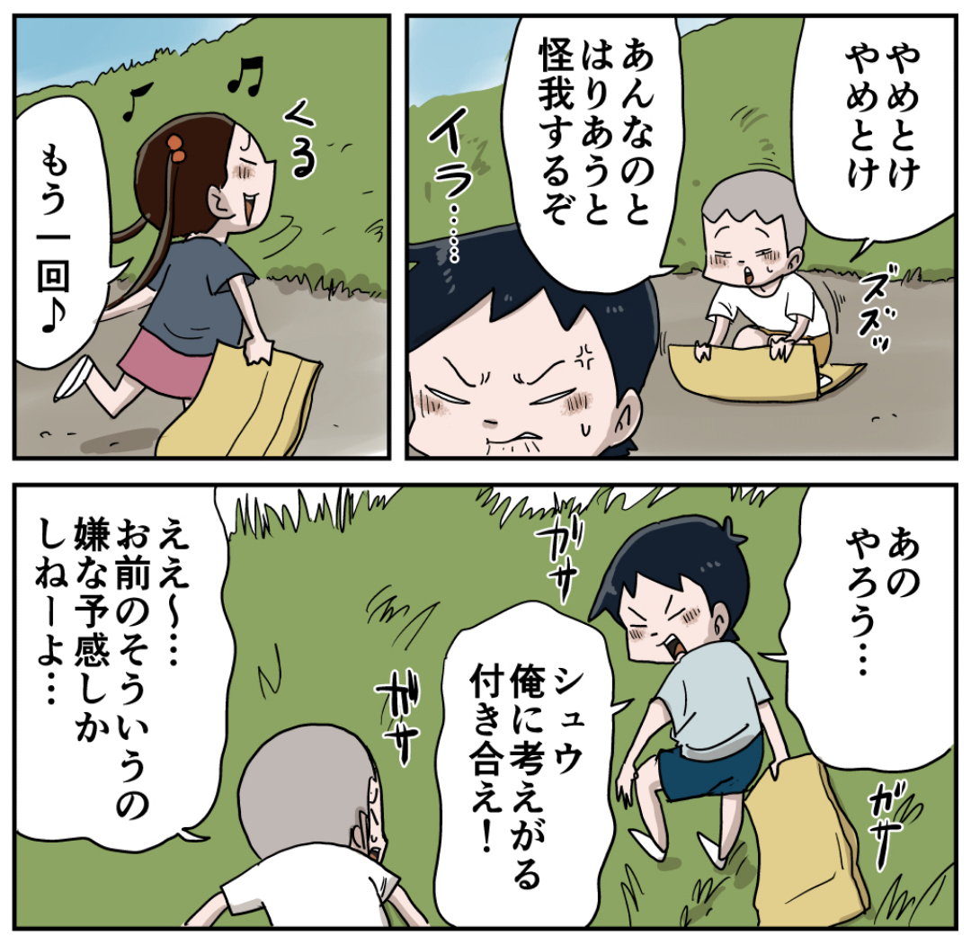 ダンボールで遊ぶ(その3 前編) 2023年07月20日 初めての方へ登場人物紹介 「段ボールで遊ぶ」を最初から読む またいくるがなんかやるぞ… ラインで更新をお知らせできます!登録してね! 「いくる(弟)」カテゴリの最新記事 タグ :#漫画#マンガ#昭和#小学生 < 前の記事次の記事 > コメント コメント一覧 (9) 1. うじゅ 2023年07月20日 22:16 いよいよアレか(^ν^) 0 仲曽良ハミ がしました 2. コーナ 2023年07月20日 22:16 マッキー無双! 0 仲曽良ハミ がしました 3. ひこひこひー 2023年07月20日 22:25 しゅう「お前のそういうの嫌な予感しかしねーよ」 読者「ほんとそれ(期待)」 0 仲曽良ハミ がしました 4. そうた 2023年07月21日 00:53 ほんとイヤな予感しかしない😆 0 仲曽良ハミ がしました 5. さかなくんちゃんさん 2023年07月21日 01:06 「オルテガ、マッシュ、シュウ、いくる 仕掛けるぞ!」 「お、おう だれだおっさん…」 0 仲曽良ハミ がしました 6. あかぎのはしりや 2023年07月21日 08:35 あれは…慣性…ドリフトだと?!!! 0 仲曽良ハミ がしました 7. カツヲ 2023年07月21日 10:10 中学生になっでマッキーと仲良しで居てほしいなぁ…😁 0 仲曽良ハミ がしました 8. 佐々木推し 2023年07月21日 17:23 確かにこの手の遊びは、最初にイメージしてたものと実際にしっくりくる遊び方と違うことが多々あったな。 考えて遊んでいたという良い象徴だ 0 仲曽良ハミ がしました 9. いつも楽しく見てます! 2023年07月21日 23:03 LINEの通知だと後編になってます… 通知来てすぐ読む派としては飛ばしたかもと焦ってしまうので…よろしくお願いします。 ハミ先生のそこら辺はわかってるんですが毎度焦ってしまいます…😁💦 いつも楽しく読んでるので頑張って下さい!! 0 仲曽良ハミ がしました コメントフォーム 名前 コメント 記事の評価 リセット リセット 顔 星 情報を記憶 コメントを投稿する