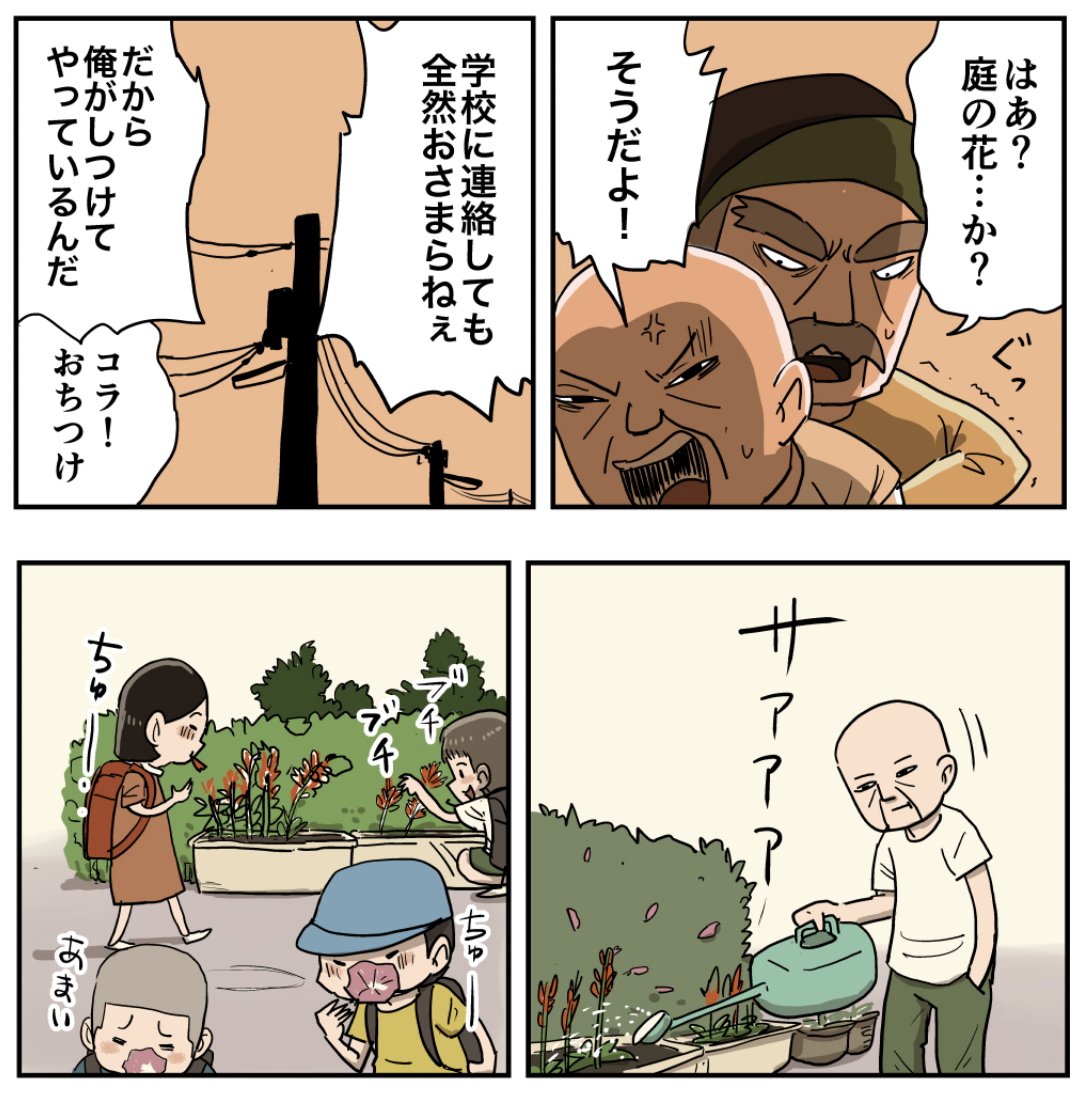 理由聞いてわかりました。でもそれは何がいけないか、理由を言わないと殴るだけだと子供は恐怖を覚えて二度とジョウロおじさん近ずかないから、最終的には看板にお花に触らないでくださいって書かないと子供には分からないと思う💦
