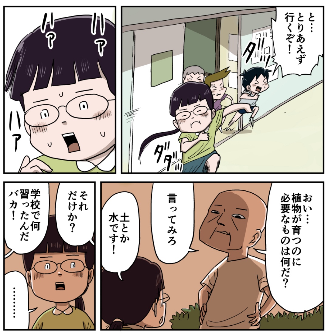 佐々木さんとジョウロさん(その11 前編) 2024年04月18日 『佐々木さんとジョウロさん』編を最初から読む えっと…どういうこと?ジョウロさん…お待たせしました!「しなのんちのいくる」4巻発売決定です!是非ご予約いただけますと嬉しいです!発売日 5/20しなのんちのいくる4もう一冊!「昭和の僕らはバカでした」こちらは仲曽良初の文章とイラストのエッセイです!発売日6/10昭和の僕らはバカでした - “小学46年生”に突き刺さる!「超ノスタルジックエッセイ」 - 「佐々木さん」カテゴリの最新記事 タグ :#漫画#マンガ#昭和#小学生 < 前の記事次の記事 > コメント コメント一覧 (33) 1. 名無しさん 2024年04月18日 19:30 言葉は荒くても理由とやることをきちんと教えてくれるジョウロさん…! 0 仲曽良ハミ がしました 2. そうた 2024年04月18日 19:33 そりゃ彼らでは100%バレるな。いくるとシュウじゃそもそも時間を守れないからな😁 0 仲曽良ハミ がしました 3. kyakya 2024年04月18日 19:35 さすがじょうろさん、植物に詳しい👍 この人に聞いたのは正解だったね😆 0 仲曽良ハミ がしました 4. ななし 2024年04月18日 19:35 ふうんそういうことか 0 仲曽良ハミ がしました 7. おっさん 2024年04月18日 19:59 >>4 知っているのか?雷電 0 仲曽良ハミ がしました 20. 令和の男塾 2024年04月18日 20:46 >>7 ぬううっ あれが世にきく亜叉我王…!! 0 仲曽良ハミ がしました 33. おっさんと同じくらいおっさん 2024年04月19日 12:30 >>7 あんた、最高だ 0 仲曽良ハミ がしました 5. 卍丸 2024年04月18日 19:54 今回のジョウロさんはなんか信頼出来る 0 仲曽良ハミ がしました 6. わかみ〜 2024年04月18日 19:57 そうそう、明るい時間が長いと花芽付かないだよね。朝顔育てるの凝ってた時、街灯が当たらない暗い場所に移動させたりしてたなあ😊 0 仲曽良ハミ がしました 8. さくら 2024年04月18日 20:00 なるほど、そういえばそうだ 0 仲曽良ハミ がしました 9. ふみや 2024年04月18日 20:01 相変わらずガラと口の悪いジョウロ氏だけどちゃんと教えてるな 勉強になる 0 仲曽良ハミ がしました 10. ファン 2024年04月18日 20:01 せっせと頑張る佐々木さんを想像したら泣ける! 0 仲曽良ハミ がしました 11. あばば 2024年04月18日 20:05 裏ワザ好きであろういくるやシュウが喜びそうw 0 仲曽良ハミ がしました 12. 名無し 2024年04月18日 20:09 植物って育てるの難しいから ジョウロさん凄いよ 0 仲曽良ハミ がしました 13. デブソン21 2024年04月18日 20:10 わははは~😆オレも鬼塚さんと一緒だわ ヘェ~そうなの😲 0 仲曽良ハミ がしました 14. つん 2024年04月18日 20:14 ジョウロさ〜ん! ちゃんと佐々木ちゃんの気持ちに応えてる! 続き気になる! ドキドキ! 0 仲曽良ハミ がしました 15. 堀江主任 2024年04月18日 20:21 ググってみたら、日没が早いほど、朝顔は早く花が咲くみたい。 夕方5時に日没で、翌朝8時に夜明けにすれば、 朝顔はこれから厳しい冬が来ると勘違いするから、早く花を咲かせて実を作ろうとするのかな? 日が長いともっとたくさん栄養を取り込んでじっくり強い種を作ろうとするから、花が咲くのは遅くなるのかな? 生命って不思議!!! 0 仲曽良ハミ がしました 16. おいいくる! 2024年04月18日 20:26 物足りないぞ! 禁断症状出るから勿体つけないでくれ笑 0 仲曽良ハミ がしました 17. かしいさえ 2024年04月18日 20:37 ジョウロさんスゴイ、学校では教えてくれないことだ!佐々木さんの情熱勝ちだね! 0 仲曽良ハミ がしました 18. 椎名ちゃん 2024年04月18日 20:38 短日処理とかめっちゃ切り札使ったやん これが いい肥料(金をかける) か、 暗がりにする(手間をかける) の勝負と 0 仲曽良ハミ がしました 19. こつぶ 2024年04月18日 20:41 🤭「そうだ光合成だ」のところ、ジョウロさんの頭から花が咲いてるみたいな絵でかわいい🌱 0 仲曽良ハミ がしました 21. 植物の魔術師ジョウロさん 2024年04月18日 20:49 「バカ ジョウロさん」ww 鬼塚さん、言うに事欠いてヒドイww 0 仲曽良ハミ がしました 22. ピータンhiroyuki 2024年04月18日 20:51 ジョウロさんめっちゃ気になる!! 続きをはよ教えてぇぇえええ 0 仲曽良ハミ がしました 23. 松尾 2024年04月18日 21:03 男塾塾生が多いなwww 如雨露のおじきは、博学じゃのう 0 仲曽良ハミ がしました 24. ナナシー 2024年04月18日 21:11 実際に大切なのは光というか土の温度って農家の人に聞いたことあるな 0 仲曽良ハミ がしました 25. だれだ? 2024年04月18日 21:14 おい、以前ジョウロさんの悪口言ってたヤツ手をあげろ。 🙋 0 仲曽良ハミ がしました 26. そるでぃ 2024年04月18日 21:53 す、すげえ・・・!完璧な理論理屈。子供の頃にこれほどの知恵を身につけられる機会ってそうそうない。 0 仲曽良ハミ がしました 27. FF 2024年04月18日 22:21 前回はダークサイドに落ちたか佐々木さんと思ったが、 そのウラでは、園芸フォースの達人、マスタージョウロ、そのパダワンの佐々木さん。 2人の間にこんなやり取りがあったなんて・・・嬉しい展開ですな。 0 仲曽良ハミ がしました 28. ゆう 2024年04月18日 22:50 3冊大人買い。第4かん 0 仲曽良ハミ がしまし