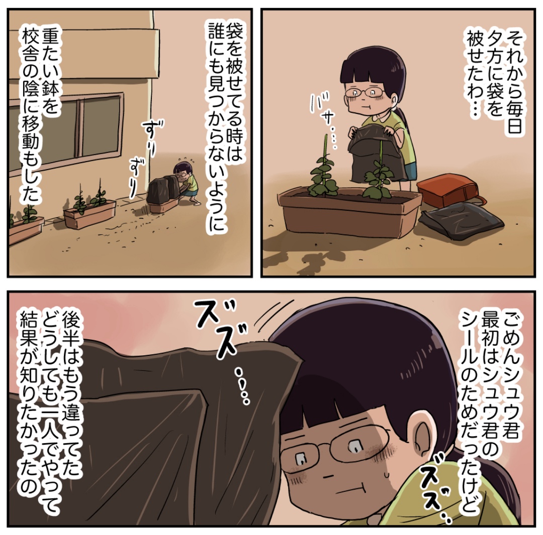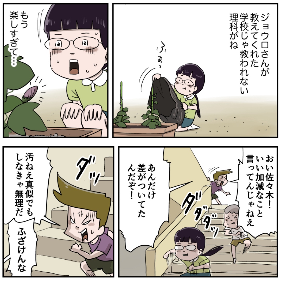 佐々木さんとジョウロさん(その12 前編) 2024年04月22日 『佐々木さんとジョウロさん』編を最初から読む お見事!さすが佐々木さん!!ジョウロさんを知らない方はこちら 佐々木さんを知らない方はこちら 「佐々木さん」カテゴリの最新記事 タグ :#漫画#マンガ#昭和#小学生 < 前の記事次の記事 > コメント コメント一覧 (45) 1. さくら 2024年04月22日 18:40 この⭐️⭐️⭐️⭐️⭐️は佐々木ちゃんとジョウロじじいに差し上げたい❗️ ドーピングせず、正当なやり方だ。 0 仲曽良ハミ がしました 37. さくら 2024年04月23日 10:12 >>1 自己コメント失礼。 一晩経って考えてみたんだけど、これ平成や令和の時代なら不正になるのかな。 ドーピングはしていないけど学校で教わっていない方法で朝顔の成長を調整した。 微妙なところではあるけど、そもそも昭和の時代の話だし、平成や令和の小学校なら学校で習っていない漢字や計算、やり方を使うと×をつけられる事もあるようだけど、昭和の時代だったらそこまで言われなかったと思ったので正当な手段と書きました。 0 仲曽良ハミ がしました 41. 😽 2024年04月24日 10:25 >>37 授業としては咲かせることそのものより経過観察 不正も正当もなくペケになるとかないよ。 この話の流れで勝負ってなってるから忘れてるけど。 だからやるべき事がお留守になってないならいいんだよ。 つまり、この話のオチとしては 二班共々 勝負に注視していた結果 観察日記を付けるのを忘れて叱られる になるんだと思う。 0 仲曽良ハミ がしました 2. 漫画郎 2024年04月22日 18:47 やったね!佐々木さん✨みつるからシール回収してジョウロさんに報告だ! 0 仲曽良ハミ がしました 3. きのりー 2024年04月22日 18:48 泣けた💦 0 仲曽良ハミ がしました 4. ファン 2024年04月22日 18:48 思わずバンザイしちゃったよ!ありがとう😊 0 仲曽良ハミ がしました 5. いわよこ 2024年04月22日 18:49 将来は科学者かな?佐々木ちゃんカッコいい! 0 仲曽良ハミ がしました 19. 植物 2024年04月22日 20:37 >>5 学者じゃない? 植物のことなら何でもOKな学者さん または農業の発展に多大な貢献をする農学博士 0 仲曽良ハミ がしました 6. ピータンhiroyuki 2024年04月22日 18:56 やったあああああああああぁぁぁ! とても勉強になりました! 子供が大きくなったら教えてあげようと思います☺️ 0 仲曽良ハミ がしました 7. もん 2024年04月22日 18:57 やったね佐々木ちゃん‼︎ 0 仲曽良ハミ がしました 8. ツン 2024年04月22日 18:57 よっしゃあ! よーやった!!! 0 仲曽良ハミ がしました 9. ふみや 2024年04月22日 19:00 リケジョ佐々木が制圧した 0 仲曽良ハミ がしました 10. しの 2024年04月22日 19:16 泣けて泣けて💧 0 仲曽良ハミ がしました 11. 2024年04月22日 19:18 ワクワクする気持ち、分かるよー! 佐々木さんやっぱりだいすき! 0 仲曽良ハミ がしました 12. なみ平 2024年04月22日 19:44 ええ話や( T∀T) 0 仲曽良ハミ がしました 13. 通りがかり 2024年04月22日 19:47 これは最高のドヤ顔!! 0 仲曽良ハミ がしました 14. かしいさえ 2024年04月22日 20:01 佐々木さん、これってスゴイ経験が出来たんじゃないかな 0 仲曽良ハミ がしました 15. デブソン21 2024年04月22日 20:06 おお〜!😲理系女😍😍😍佐々木さん ありがとう😌ジョウロも 0 仲曽良ハミ がしました 16. ラビット愛 2024年04月22日 20:15 ドキドキしました。 0 仲曽良ハミ がしました 17. ばりぃ 2024年04月22日 20:18 佐々木さんの探究心、好奇心が花を咲かせたね! 0 仲曽良ハミ がしました 18. 通りすがり 2024年04月22日 20:36 なんか泣ける! 0 仲曽良ハミ がしました 20. kyakya 2024年04月22日 20:41 やったぁぁぁあ!!! めちゃくちゃ嬉しいよ!!! 0 仲曽良ハミ がしました 21. あばば 2024年04月22日 20:50 シュウ「ヘッド?いらねぇよ、オレはなんもしてねぇからな」 0 仲曽良ハミ がしました 22. たま 2024年04月22日 20:51 佐々木さんの汗が光るどや顔スマイルにほろっとさせられる 0 仲曽良ハミ がしました 23. むな 2024年04月22日 21:03 ゆみちゃんの努力が実ってなにより 0 仲曽良ハミ がしました 24. 今岡7 2024年04月22日 21:10 さすが佐々木さん!将来は理科の先生になって欲しいです。頑張れ佐々木さん! 0 仲曽良ハミ がしました 25. FF 2024年04月22日 21:11 個人的な話ですが、家の前のさくらが散ってしまって少し淋しさを感じていましたが、佐々木さんの朝顔で癒されました。ありがとう! 0 仲曽良ハミ がしました 26. Django 2024年04月22日 21:14 お〜〜咲いた咲いた! 佐々木さんエライ! 0 仲曽良ハミ がしました 27. デデクロ 2024年04月22日 21:29 あんな事したジョウロのオッサンが、 口は悪いけど子供にアドバイスして、 そして、その子が喜んだ。 ナカソラさんは誰も見捨てないんだよな。 0 仲曽良ハミ がしました 28. ナナシー 2024年04月22日 21:34 多分、先生には両方の不正がバレて勝負はなしになるだろうね でも佐々木さん自身にはすごい勉強になったからいいと思われ 0 仲曽良ハミ がしました 32. めけめけ 2024年04月23日 00:14 >>28 不正? 0 仲曽良ハミ がしました 29. 今回だけは 2024年04月22日 21:36 ジョウロジジ