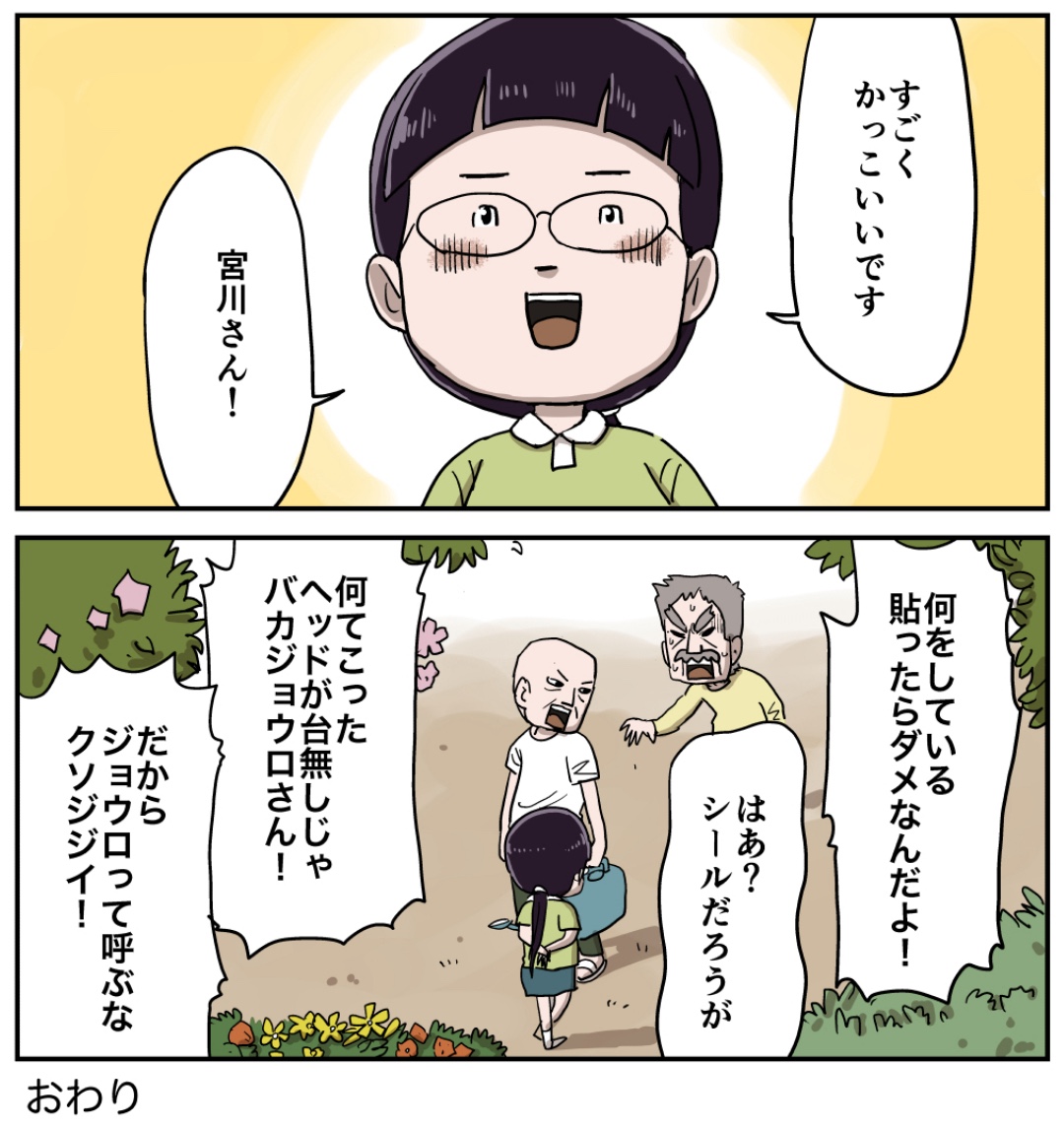 「佐々木さんとジョウロさん」最後まで読んでいただいてありがとうございます。この話はジョウロさん、いや宮川さんの為に描きました。以前大暴れした宮川さんの違う面を描きたかったのです。