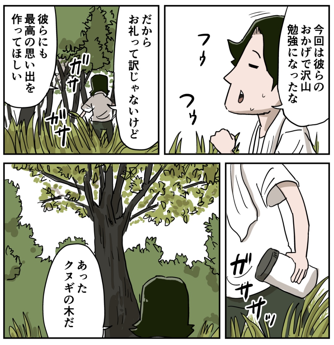 みんなの林間学校(その14後編)早朝 2024年08月12日 最初から読む 駒形さん早起きして何してるの? 「いくる(弟)」カテゴリの最新記事 タグ :#漫画#マンガ#昭和#小学生 < 前の記事次の記事 > コメント コメント一覧 (17) 1. さくら 2024年08月12日 18:18 もしかして、カブトムシかクワガタ? 子供達の歓喜の表情が想像できる。 0 仲曽良ハミ がしました 2. まじょたく 2024年08月12日 18:59 子どものころは虫を手づかみできたけど、 大人になると出来ないよねぇ〜 0 仲曽良ハミ がしました 3. ファーン 2024年08月12日 19:00 もしやミヤマクワガタでは? 0 仲曽良ハミ がしました 4. そうた 2024年08月12日 19:36 シュウの寝相よ。あれで熟睡出来るのか?🤣 0 仲曽良ハミ がしました 5. か 2024年08月12日 21:17 すでに明るいじゃん。遅いよ。前夜に塗って、朝は3時起きで見に行かないと。 まあ、電球トラップの方が集まるけど。 0 仲曽良ハミ がしました 11. 😽 2024年08月14日 02:08 >>5 水銀灯の凄まじさよ 0 仲曽良ハミ がしました 6. あばば 2024年08月12日 22:09 スズメバチに注意 0 仲曽良ハミ がしました 7. かおる 2024年08月13日 06:30 あーなんとも懐かしいな ラジオ体操の歌が頭の中で流れてくる 0 仲曽良ハミ がしました 8. FF 2024年08月13日 10:20 「勉強になった」「お礼」なんて・・・コマちゃん優しいなぁ・・・ 多分、コマちゃんにも子供たちは同じ思いを抱く事でしょうな。 最終話が近づきつつあるが、もうオレ泣きそうw 0 仲曽良ハミ がしました 9. にい 2024年08月13日 14:12 こういう仕事の人って休みのサイクルとかどうなってるんだろう? 朝からいて翌日午後まで泊りがけ仕事ってすごい長時間だし、一校終わったら数日休みとかになるのかな? 0 仲曽良ハミ がしました 12. 😽 2024年08月14日 02:11 >>9 マジレスすると通いじゃないならシーズンは施設に入りっぱなし 月に何回か麓に降りる感じ。 期間工とかあれに近い生活になる。 0 仲曽良ハミ がしました 13. にい 2024年08月14日 10:41 >>12 解説ありがとう 一般的な勤め人とは違うスタイルなんだね 0 仲曽良ハミ がしました 10. 椎名ちゃん 2024年08月14日 02:07 佐々木さんに先生、眼鏡のその置き方はあかん! 起きたら探すことになるし、ひしゃげてて驚くことにもなりかねん 0 仲曽良ハミ がしました 14. せ 2024年08月14日 22:20 マッキーが寝てる! 可愛い 0 仲曽良ハミ がしました 15. sutaburai 2024年08月14日 22:56 いくるとマッキー 寝相が同じ😁 0 仲曽良ハミ がしました 16. QB 2024年08月15日 05:10 ごめん寝してるwww 0 仲曽良ハミ がしました 17. NEM0 2024年11月09日 03:14 『クヌギの木』でだいたいピンとくる男は多い。 0 仲曽良ハミ がしました コメントフォーム 名前 コメント 記事の評価 リセット リセット 顔 星 情報を記憶 コメントを投稿する