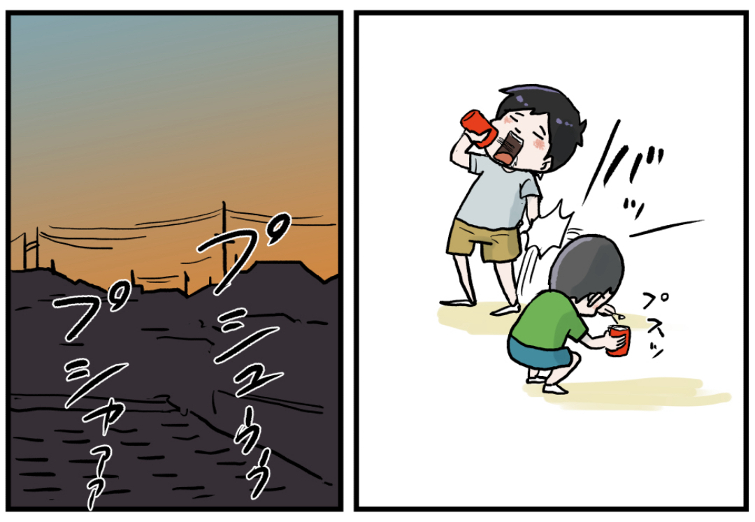 コーラの飲み方 2021年04月13日 この飲み方をやったことがある方は結構多いんじゃないですか?僕は一時期これにハマっていつもコーラを浴びていました。めちゃくちゃ楽しいし美味しいんだけどその代償は飲めなくなったコーラとベトベトにアリがが集りそうなお顔でしょうか…まあこの年頃の男子は後のことなど全く考えてませんから…笑 「いくる(弟)」カテゴリの最新記事 タグ :#漫画#思い出#懐かしい#あの頃#コーラ#マンガ#小学生#ジュース#自動販売機#絵日記 < 前の記事次の記事 > コメント コメント一覧 (8) 1. ゆーや 2021年04月17日 18:35 めっちゃやりました笑 0 仲曽良ハミ がしました 2. たいせい 2021年04月17日 20:03 俺かな? 0 仲曽良ハミ がしました 3. あ 2021年05月02日 16:41 先に穴開けて穴を指で塞いで振ってましたね 0 仲曽良ハミ がしました 4. だのん 2022年03月31日 22:28 プルタブをとめてある丸い部分が意外と柔らかかくて穴開けやすかったなww 0 仲曽良ハミ がしました 5. コケコーラ 2022年05月24日 12:00 懐かしすぎる。よく覚えてますなー 0 仲曽良ハミ がしました 6. でぶメッキー 2024年03月17日 19:43 この遊びは知らなかったですww そんなベトベトで帰って… アホかわいいとは…このこと… 0 仲曽良ハミ がしました 7. NEM0 2024年11月09日 03:24 まだ引っこ抜くタイプのプルタブだったころ、書けなくなったボールペンとかで指輪と缶の接合ピンのところをぶち抜いて同じことやりました〜。 炭酸抜けるまで穴を指で塞いで振っては飲み振っては飲み。 懐かしい。 0 仲曽良ハミ がしました 8. かいちゃん 2025年08月02日 10:47 男子ってアホだなあ…ってのが女子の感想だったでしょうねぇ。でも、可愛いですよね。今やお母さんは大変だったろうなあ、とそっちの気持ちを思い計ってしまう。あの頃に戻りたいな。 0 仲曽良ハミ がしました コメントフォーム 名前 コメント 記事の評価 リセット リセット 顔 星 情報を記憶 コメントを投稿する
