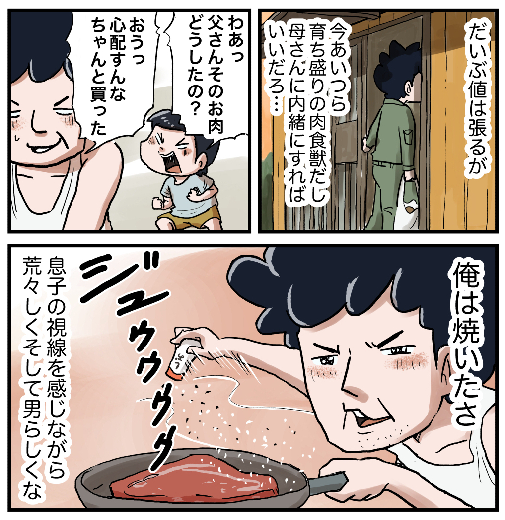 お父さんが焼いたお肉 2021年04月18日 お父さんが焼いたお肉こんにちは、仲曽良です。こんなシチュエーションの時ってお父さんの腕の見せ所だったりしますよね…ただ気合の入るあまり空回りする事もしばしばみたいな…。まあ作中のお父さんは普段料理をしないくせに素材にこだわった豪快な男飯をイメージしていたのでしょう。うまくいったらかっこいいし子供達の尊敬も手に入りますしね…気持ちはわかります。結果お母さんのご飯がいかに美味しいかを再確認する事になるんですよね。僕もいまだに塊のお肉は上手に焼けません…。 「いくる(弟)」カテゴリの最新記事 タグ :#漫画#肉#お父さん#料理#ステーキ#懐かしい#あの頃#思い出#絵日記#マンガ < 前の記事次の記事 > コメント コメント一覧 (15) 1. 秋味と、やま 2021年04月19日 00:14 心配すんな ちゃんと買ったって台詞が最高過ぎますw 0 仲曽良ハミ がしました 2. み 2021年04月19日 00:26 一応タイムセールのやつ買ってるところがミソ🤣 0 仲曽良ハミ がしました 3. あ 2021年04月20日 19:27 CV屋良有作 0 仲曽良ハミ がしました 4. ゆ 2021年08月30日 05:17 あれって たたきにしたりチャーシューにしたりする肉だよね! 0 仲曽良ハミ がしました 5. 仲曽良 2021年08月31日 03:26 >>4 分厚いやつですw 0 仲曽良ハミ がしました 6. たけ 2021年09月01日 08:03 塊肉は、鮮度にもよりますが周りだけ焼いて少し電子レンジで温めてローストポークにするのがすきです。 とはいえ、「硬ぇ」のお父さんの顔が秀逸で好きさが増します。 0 仲曽良ハミ がしました 7. 仲曽良 2021年09月01日 16:19 >>6 ローストポーク! 柔らかそうw 0 仲曽良ハミ がしました 8. 詠み人知らず 2022年02月03日 03:09 いい家族ですねー😊 0 仲曽良ハミ がしました 9. ふぁん 2022年02月06日 11:15 胡椒(?)をふぁっさー…と振るお父さんの顔がツボ過ぎて、ちょいちょい見に来ます。超ドヤ顔。ほんま好き笑。 0 仲曽良ハミ がしました 10. ふぁん 2022年02月06日 11:16 >>9 よく見たらしおでした。 0 仲曽良ハミ がしました 11. 2022年08月06日 12:40 見た目美味しそうなのにかったい肉ありますよねww 熱しすぎると更にカチカチに…。 お父さんドンマイ!!! 0 仲曽良ハミ がしました 12. タフ 2023年08月14日 01:47 肉食獣w 0 仲曽良ハミ がしました 13. れっくん 2024年01月22日 11:05 ここのお話すき サザエさんみたいにアニメ化してもらって 毎週みたい♡♡ 0 仲曽良ハミ がしました 14. NEM0 2024年11月09日 04:04 たまにやる料理に張り切ってしまう男心、ワカル。 父ちゃん、結構男らしいロマンティックなタイプの人なんだろうなぁとおもいました。そこがまた、いくるの父ちゃんらしいというか。 ドヤ顔でキメた調理シーンからの、実食であの顔w でも、美味いモン喰わせてやりたいって親心と、子どもにカッコイイところを見せたい男心みたいなのがすごく伝わってきて、親父回、いつも楽しく読ませていただいてマス! 0 仲曽良ハミ がしました 15. にゃにゃ 2025年02月14日 20:29 お父さん…どんまい 0 仲曽良ハミ がしました コメントフォーム 名前 コメント 記事の評価 リセット リセット 顔 星 情報を記憶 コメントを投稿する