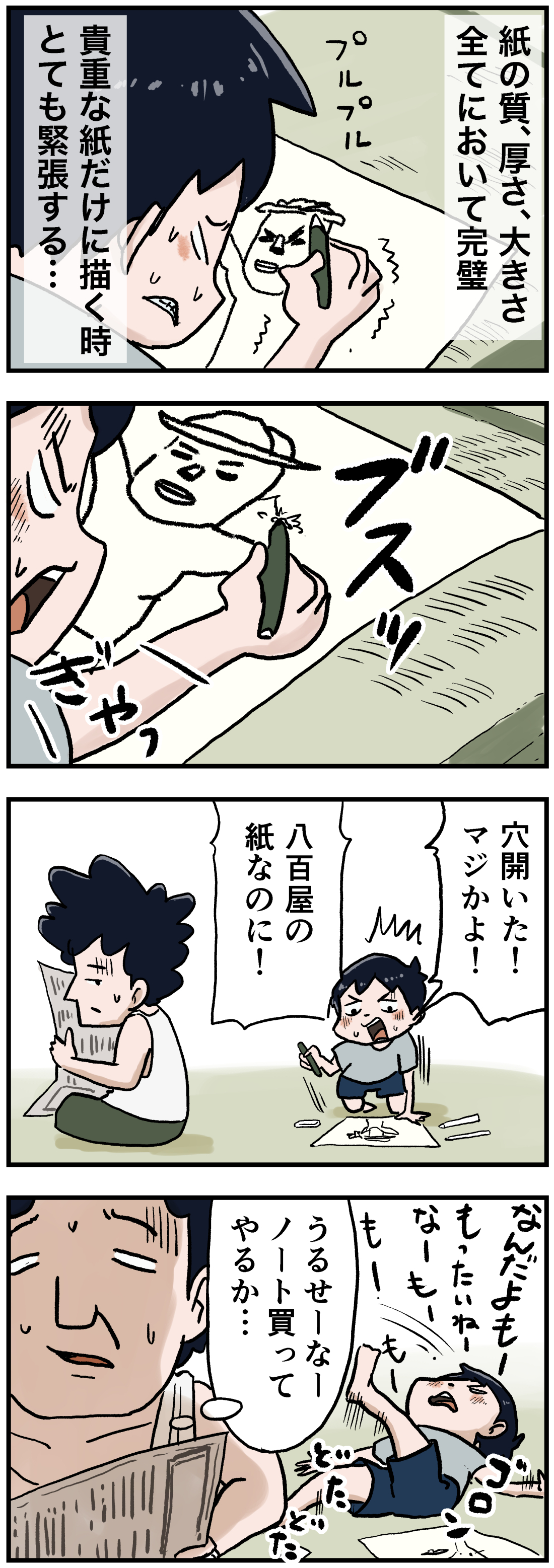 道具にはこだわってます! 2021年05月02日 道具にはこだわってます!こんにちは仲曽良です。絵を描くことが好きないくるは紙にはこだわります。主に鉛筆を使うので練習用につるつるの光沢紙、本番用に八百屋のざらざらの紙といったところでしょうか?つうか畳に直置きで描くなよ!下敷き使えよバカ!って感じですが。その辺がいくるらしいところではないでしょうか…きっと見かねたお父さんがきっと無地のジャポニカ学習帳を買ってくれたことと思います 笑 「いくる(弟)」カテゴリの最新記事 タグ :#漫画#マンガ#思い出#懐かしい#あの頃#チラシ#落書き#昭和#平成#絵日記 < 前の記事次の記事 > コメント コメント一覧 (5) 1. りん 2021年05月02日 08:15 分かります、探しました私も!ざらついたやつじゃなきゃ嫌なんです! 最近は裏が白い広告が無くて、クリエイティブな子供には少し残念ですね… 0 仲曽良ハミ がしました 2. 詠み人知らず 2022年02月25日 01:02 実家が文房具屋でした。ジャポニカ学習帳懐かしい! 0 仲曽良ハミ がしました 3. おデュん 2022年09月28日 12:54 いくるカレクック描いてる♬ ナイスなチョイスだな👍 0 仲曽良ハミ がしました 4. 厶。 2023年11月10日 13:33 うわぁーーー!懐かしい!!自分もやってました。藁半紙みたいな紙はインクが滲んで書きづらかったり、ツルツル光沢紙は滑るから描き辛かった。何百枚も描いたキン肉マン。何枚か残しておけば良かったなぁ。 0 仲曽良ハミ がしました 5. かいちゃん 2025年08月03日 13:29 チラシの紙によっては、ホント描き辛かったですよね。この話は最後のコメントとセットでめっちゃ面白かったです。 0 仲曽良ハミ がしました コメントフォーム 名前 コメント 記事の評価 リセット リセット 顔 星 情報を記憶 コメントを投稿する