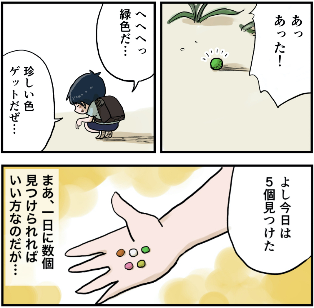 BB弾を拾い集めてた思い出 2021年05月20日 BB弾を拾い集めてた思い出当時はそこら中に落ちていました。同じ大きさでいろんな色があるから集めたくなるんでしょうね。本来エアーガンの弾なんでしょうが、本体で遊ぶのはもう少し先になりますでしょうか。とにかく珍しい色を見つけた日はラッキー!蛍光っぽい透明なやつとかはお宝扱いでしたね 笑 「いくる(弟)」カテゴリの最新記事 タグ :#漫画#マンガ#懐かしい#あの頃#思い出#絵日記#BB弾#昭和#平成#コレクション < 前の記事次の記事 > コメント コメント一覧 (11) 1. あ 2021年05月20日 12:58 おもちゃ屋かプラモ屋ではちみつの入れ物みたいなのにぎっちり詰まったのが安く売ってるのを見付けて拾わなくなるまでがお約束の流れ 0 仲曽良ハミ がしました 2. 仲曽良 2021年05月20日 16:49 >>1 確かにw 0 仲曽良ハミ がしました 3. い 2021年05月29日 13:15 ところで,姉ちゃんが借りていった10巻は枕の下から発掘されたものでしょうか(笑) 0 仲曽良ハミ がしました 4. 仲曽良 2021年05月29日 21:10 >>3 いえ、あのときはいくるの自爆です。 0 仲曽良ハミ がしました 5. たぬき 2021年07月14日 14:02 9歳の息子も全く同じことしてて、笑っちゃいました! 0 仲曽良ハミ がしました 6. 仲曽良 2021年07月14日 22:30 >>5 昔と変わらずですね☺️ 0 仲曽良ハミ がしました 7. カモン 2021年09月12日 17:26 その発想はなかった笑 0 仲曽良ハミ がしました 8. 仲曽良 2021年09月13日 00:45 >>7 米粒でおにぎりのイメージ 0 仲曽良ハミ がしました 9. よしこ 2022年02月23日 20:14 私も子供の頃B B弾の弾を拾って歩いてましたが、そもそも B B弾が何か知らなかったので、なんかとてつもなく凄いものなんだろうなと思いながら瓶に溜めてました。 0 仲曽良ハミ がしました 10. 昭和54年 2022年04月02日 01:37 懐かしい!集めてました。珍しい色のヤツ見つけたときは最高の気分でした。 0 仲曽良ハミ がしました 11. 2022年08月06日 16:58 BB弾集めてたの私だけじゃなかったんだ笑 当時それがなんなのかは分かってなかった。。 あれどこにでも落ちてるのに、撃ち合いしてるのは見たことないなぁ。 0 仲曽良ハミ がしました コメントフォーム 名前 コメント 記事の評価 リセット リセット 顔 星 情報を記憶 コメントを投稿する