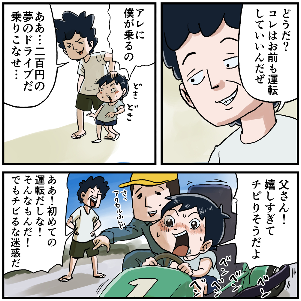 二百円の夢のドライブだ!乗りこなせ! 2021年05月21日 二百円の夢のドライブだ!乗りこなせ!初めてのゴーカートは興奮しましたね。なんせエンジン付いてますから。凄い音してるし少し怖くてヒヨッった覚えがあります全然スピード出てないのに縁石にゴリゴリ擦ってましたねあの安全なバンパーを。確か数百円だったと思いますがもう一周のリベンジを父にお願いしましたがダメでした 笑男の子は操縦が大好き!だってもしかしたら自分はニュータイプかもしれない可能性はありますからね! 「いくる(弟)」カテゴリの最新記事 タグ :#漫画#マンガ#懐かしい#あの頃#思い出#絵日記#ゴーカート#昭和#平成#お父さん < 前の記事次の記事 > コメント コメント一覧 (8) 1. よしひろ 2021年05月21日 07:43 やっぱり母は偉大ですね! 親孝行せなあかんって思いました! 0 仲曽良ハミ がしました 2. よしひろ 2021年05月21日 07:45 >>1 間違えました(,,゚Д゚) 虫垂炎の話しにコメントしたつもりが… 0 仲曽良ハミ がしました 3. 仲曽良 2021年05月21日 14:45 >>1 本当ですね母に感謝ですね 0 仲曽良ハミ がしました 4. ゆう 2021年05月21日 20:36 いくるくんとお父さんの関係性がすごく好きです。 こんな父親になりたいしこんな息子がほしい 0 仲曽良ハミ がしました 6. 仲曽良 2021年05月22日 16:35 >>4 ありがとうございます! 0 仲曽良ハミ がしました 5. ken.ny 2021年05月21日 20:36 いくるくんとお父さんの関係性がすごく好きです。 こんな父親になりたいしこんな息子がほしい 0 仲曽良ハミ がしました 7. たけ 2021年09月01日 08:07 電気式より、エンジンタイプは興奮しました。 自分がどうだったはかは覚えてませんが、子供が5歳の頃カートスクールに行かせました。 1時間の練習後、初の単独走行で5km/h位だったのを思い出しました…。 0 仲曽良ハミ がしました 8. 仲曽良 2021年09月01日 16:21 >>7 興奮しますよね エンジン 0 仲曽良ハミ がしました コメントフォーム 名前 コメント 記事の評価 リセット リセット 顔 星 情報を記憶 コメントを投稿する