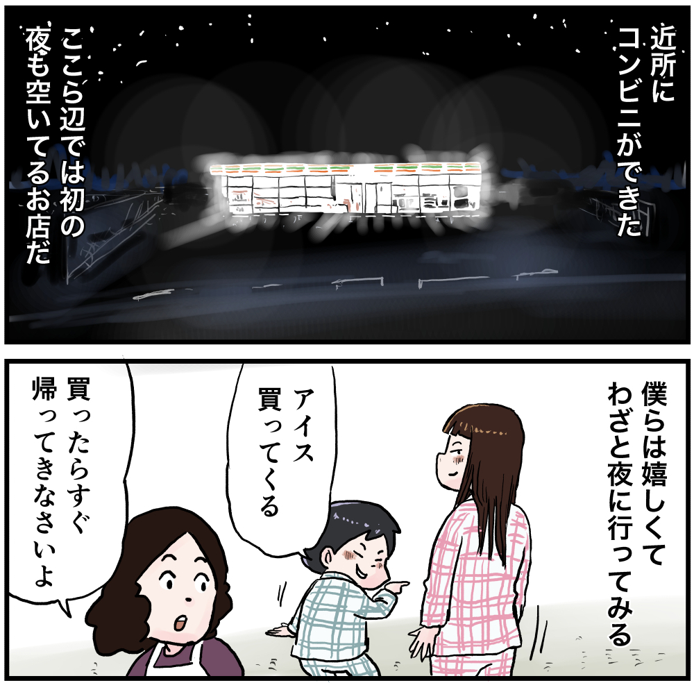 夜に行くから楽しいんだな 2021年05月31日 夜のコンビニ近所のコンビニなら夜に出歩く事も許されていた記憶があります。風呂上がりにパジャマでアイスなんかを買いに行くのがとても楽しくて少しハマってましたね。で、田舎なもんだからタヌキなんかと遭遇することもしばしば 笑 あの頃の夏の記憶はなぜこんなにも鮮明に覚えているんだろうほんとに楽しかったんだろうな…まあ今も楽しいけどさ。 「しなの(姉)」カテゴリの最新記事 タグ :#漫画#マンガ#懐かしい#あの頃#思い出#絵日記#昭和#平成#コンビニ#アイス < 前の記事次の記事 > コメント コメント一覧 (5) 1. ともたん 2021年06月02日 16:16 上海がに食べたい~ つい口ずさんじゃいますよね。 この曲好きです。 すごくわかります ゆるーい感じ😆👍️❤️ 0 仲曽良ハミ がしました 2. 仲曽良 2021年06月02日 20:30 >>1 覚えちゃいますw 0 仲曽良ハミ がしました 3. やよひろ 2021年09月29日 17:04 私の実家は田んぼに囲まれたど田舎です。 距離があるので歩いては行けませんが夜20時ごろに車でコンビニやファストフード店に行くのがなんとなく特別感あって嬉しかったのを思い出しました。 うちの親はコンビニやファストフード店を利用していなかったので行くってなったらそれは嬉しかったですね! 0 仲曽良ハミ がしました 4. 仲曽良 2021年09月30日 09:53 >>3 僕の所も田んぼの真ん中でしたw 0 仲曽良ハミ がしました 5. もょもと(本人) 2023年09月03日 23:19 僕のところは町中でしたが田んぼは小さいのが1か所ありました。みんなでカブトエビ取りしてましたがその最後の田んぼも小6の時消滅してセブンに… この頃のセブンのカラーは赤っぽかったですよね。ポストミックスとか売ってて 0 仲曽良ハミ がしました コメントフォーム 名前 コメント 記事の評価 リセット リセット 顔 星 情報を記憶 コメントを投稿する