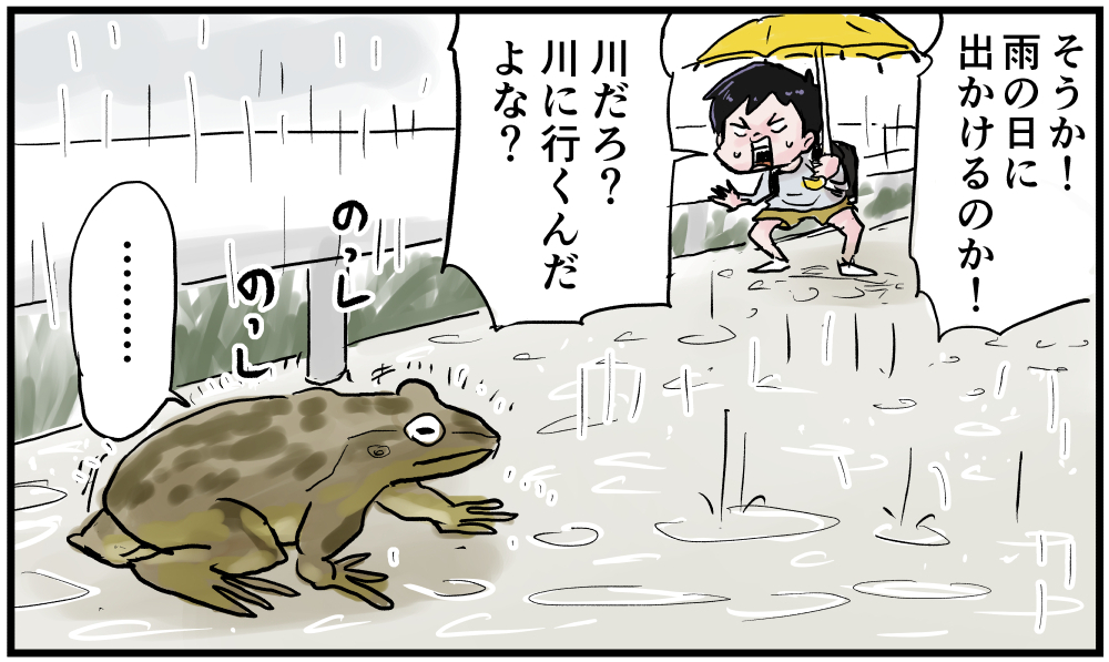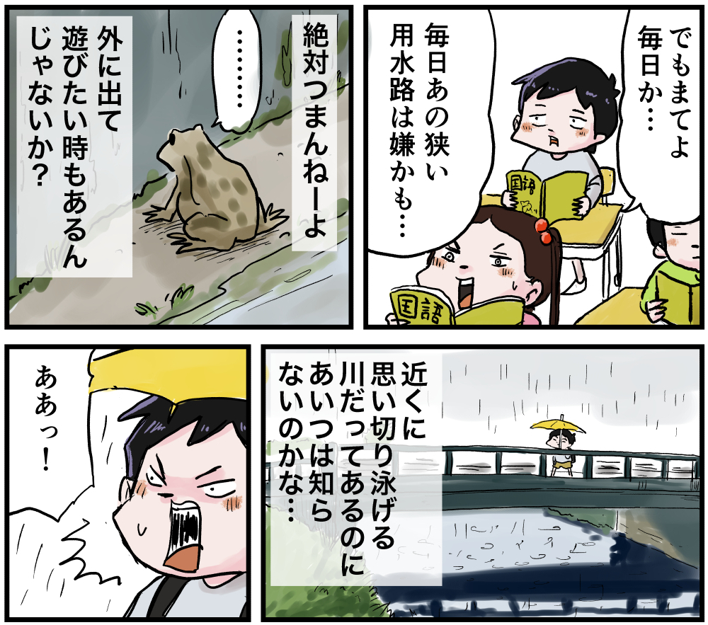 ずっとそこにいるの? 2021年06月03日 ずっとそこにいるの?いつも大体同じ所に浮いてるんですよ。学校の行き帰りに必ず確認してましたよ、たまに居ないと少し心配になりましたね。通学路にはそんな楽しいポイントがいくつかあったように思います。まっすぐ帰れない子でした。 「いくる(弟)」カテゴリの最新記事 タグ :#漫画#マンガ#懐かしい#あの頃#思い出#絵日記#昭和#平成#カエル#用水路 < 前の記事次の記事 > コメント コメント一覧 (4) 1. アユマジロ 2021年07月18日 21:47 いないと心配になる…わかるな〜 私も夜の散歩の時にいつも同じ場所にトカゲがいて通る度に声をかけてるから、たまにいないと何となく寂しい。 子どもの頃ではなくて今現在の話だけど笑 0 仲曽良ハミ がしました 2. 仲曽良 2021年07月18日 22:13 >>1 いないと心配になりますよね 0 仲曽良ハミ がしました 3. ヒコ 2021年08月17日 07:35 ウシガエルかなぁ。 アイツは外来種で、多分そこの用水路の頂点に君臨してるから、ずーっと同じ場所にいても平気なんでしょうね。 0 仲曽良ハミ がしました 4. 仲曽良 2021年08月17日 09:34 >>3 多分ウシガエルですねw 0 仲曽良ハミ がしました コメントフォーム 名前 コメント 記事の評価 リセット リセット 顔 星 情報を記憶 コメントを投稿する